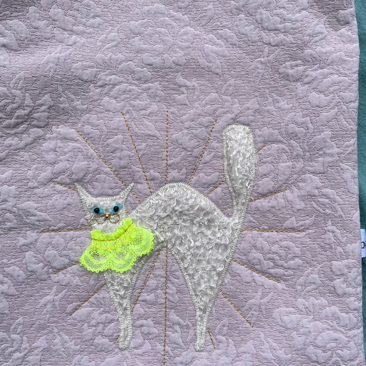 柔らかいライラックの生地にふさふさとした白猫ちゃん、そこにパッと明るい黄色が輝く首輪をつけています。