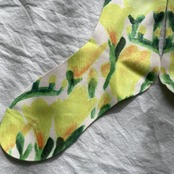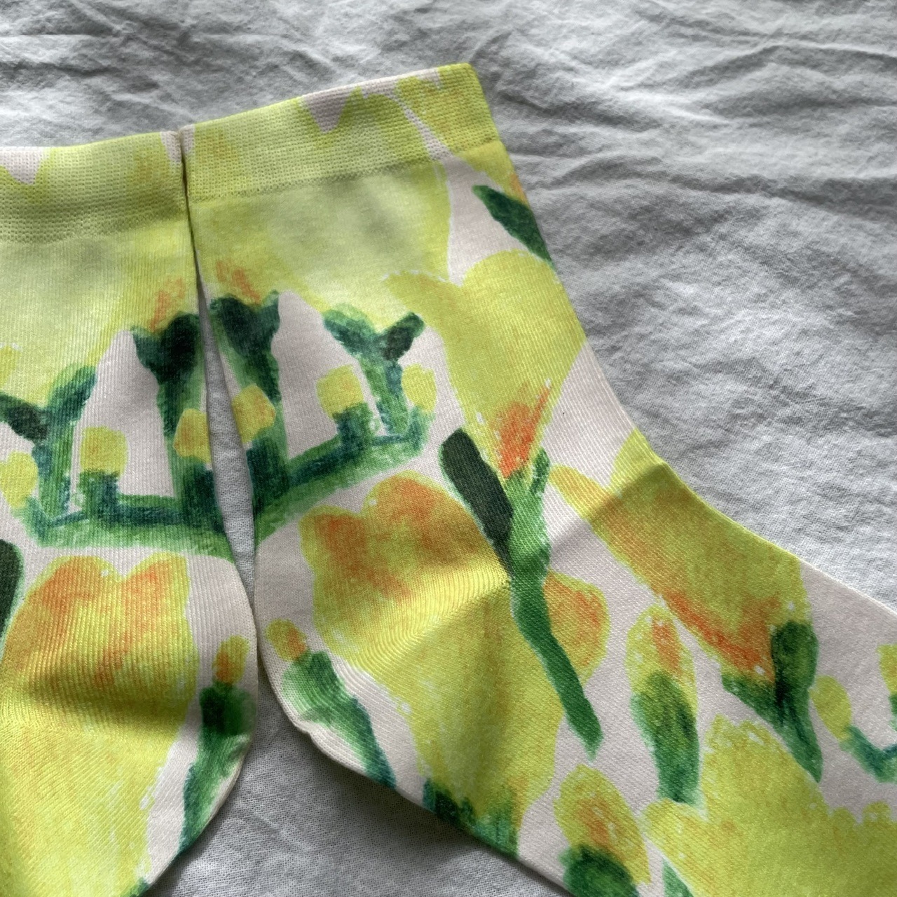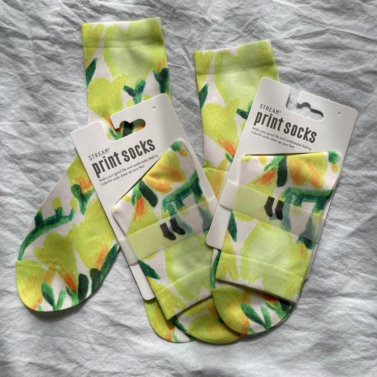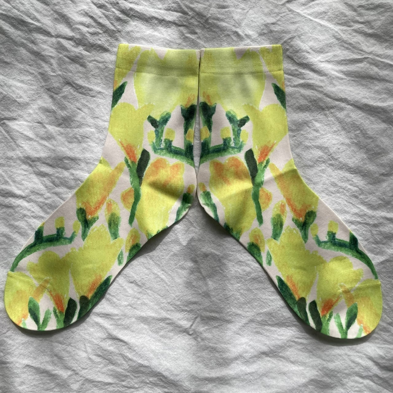 とっても華やかで明るくて、履くと足元がちょっと賑やかになるフリージアモチーフにした靴下をセレクトしました。