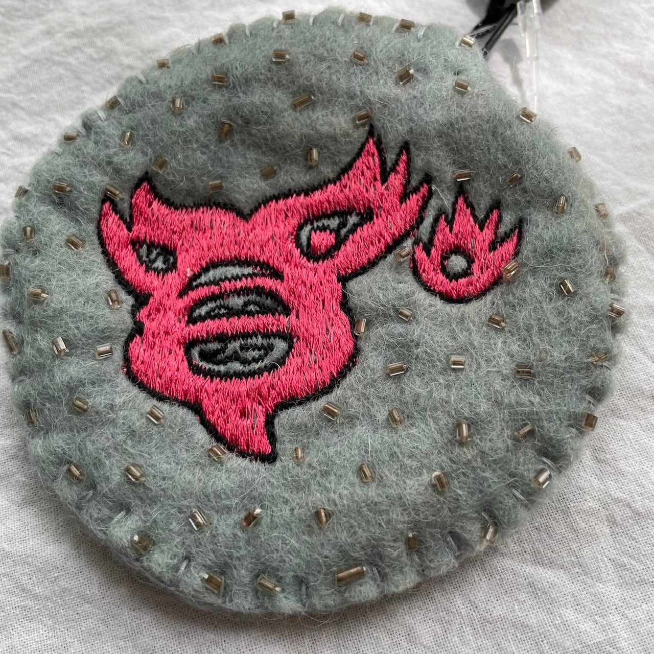 綺麗な生地の上に、ビビッドなカラーでマスクマンの刺繍が施されていて、ちまちまと手縫いで縫い付けているビーズも可愛らしい♪