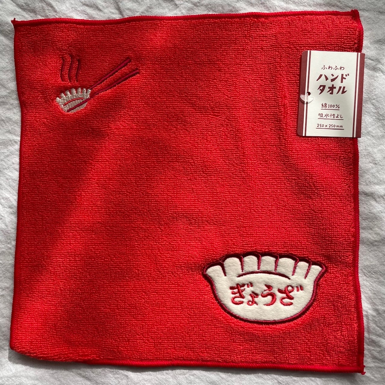 手触りが良く程よい厚みのパイル地に「ぎょうざ」が刺繍がされています。