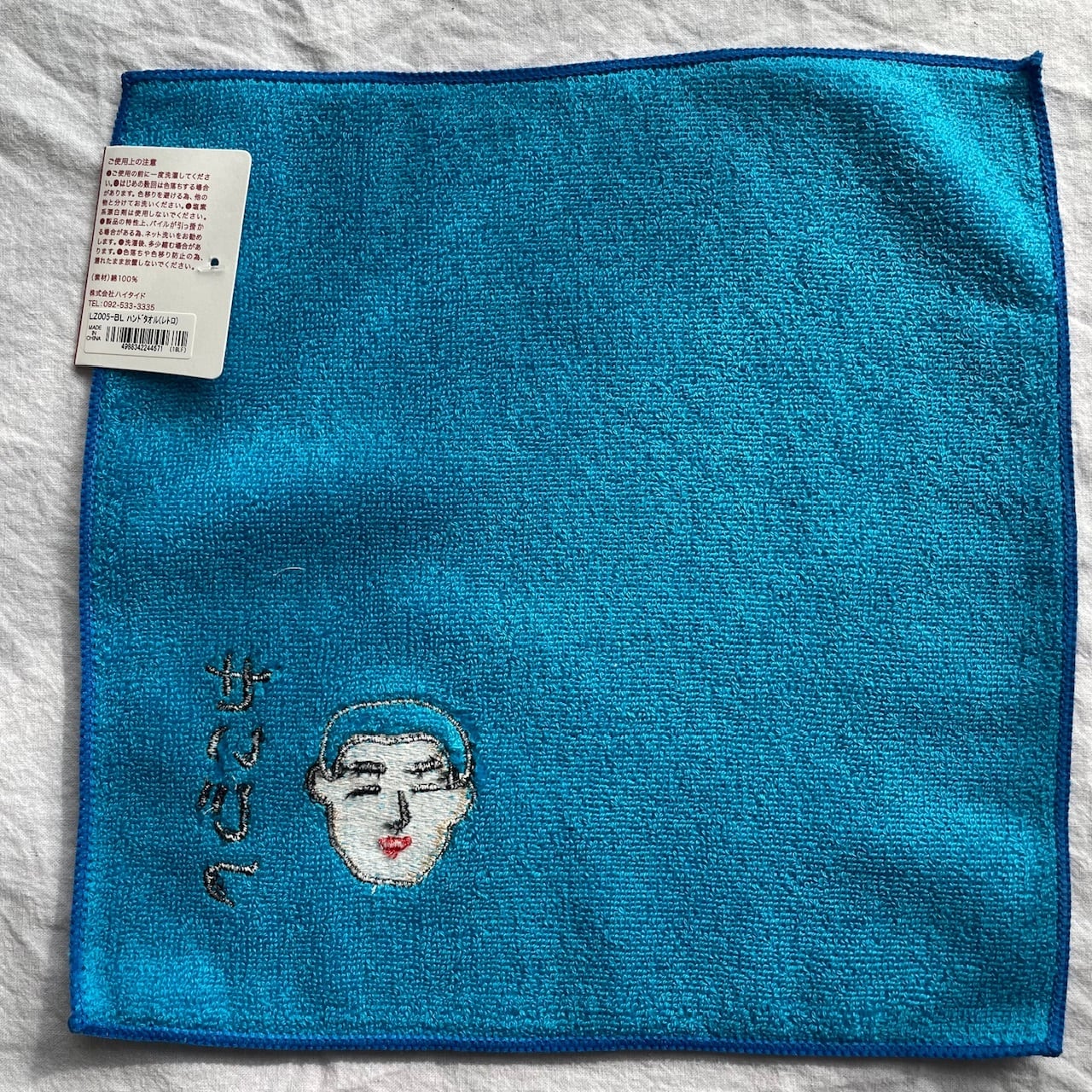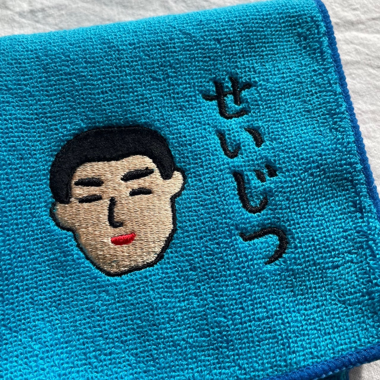 綺麗な青い生地に「せいじつ」そうなお顔の男性が刺繍されたハンカチをセレクトしました。