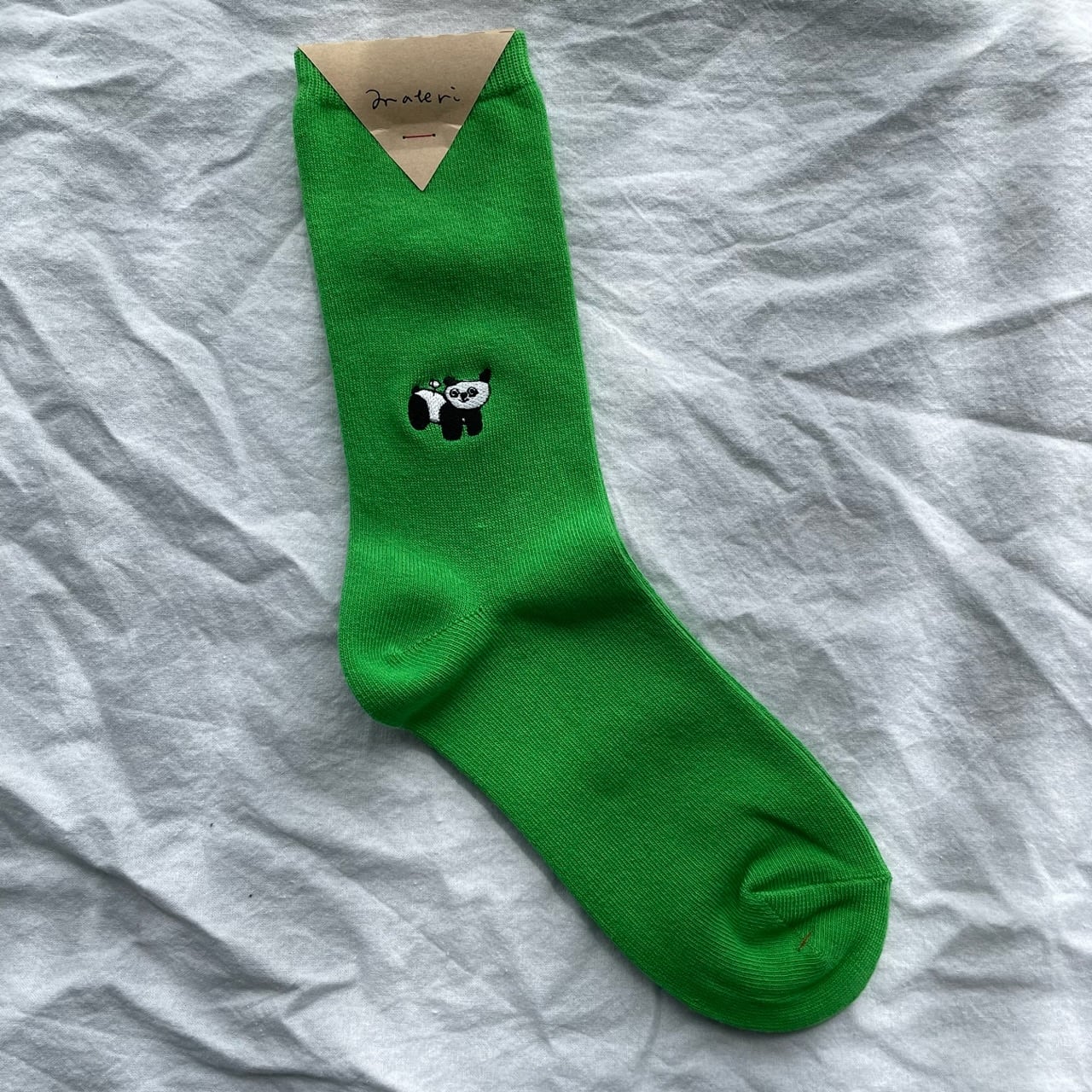 パンダ柄のアイテムを探している時に今回目に留まったのはミズノマサミさんがデザインしたちょっとおとぼけパンダちゃんの刺繍が可愛いmateriの靴下です。
