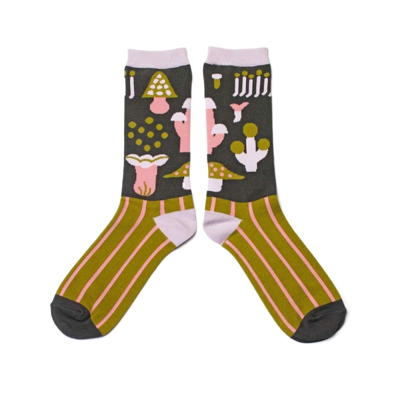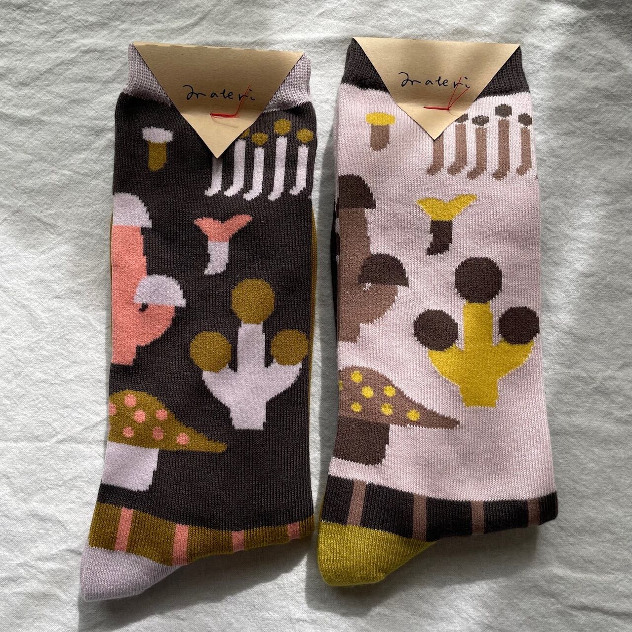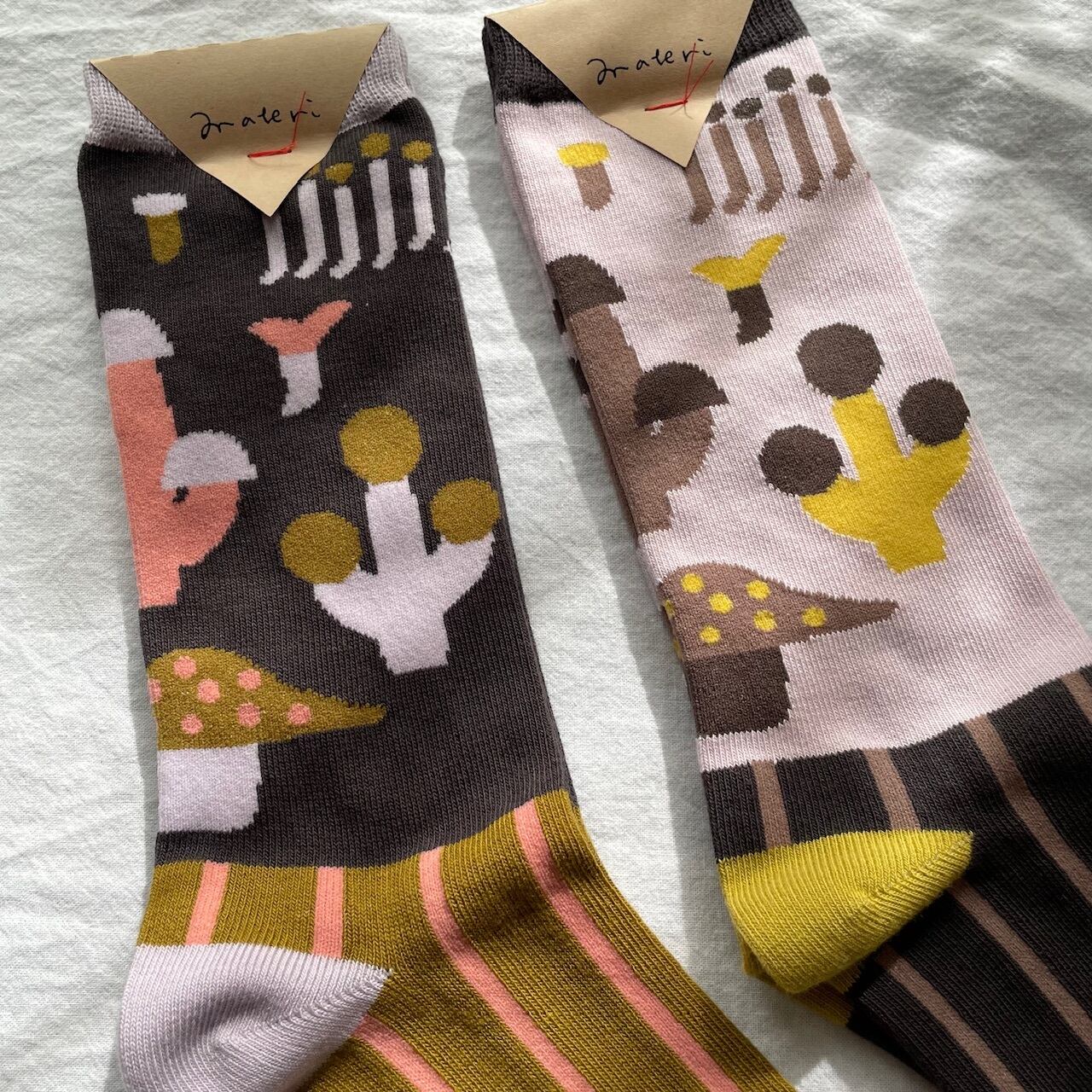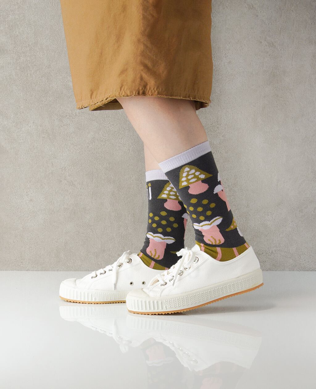 身の回りにあるモチーフや人や生き物などを素朴にゆるく絵にしたり、デザインされているイラストレーターのますたにあやこさんが描いたきのこ柄の靴下をセレクトしました。