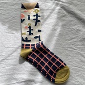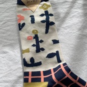 身の回りにあるモチーフや人や生き物などを素朴にゆるく絵にしたり、デザインされているイラストレーターのますたにあやこさんが描いたガーデニング柄の靴下をセレクトしました。