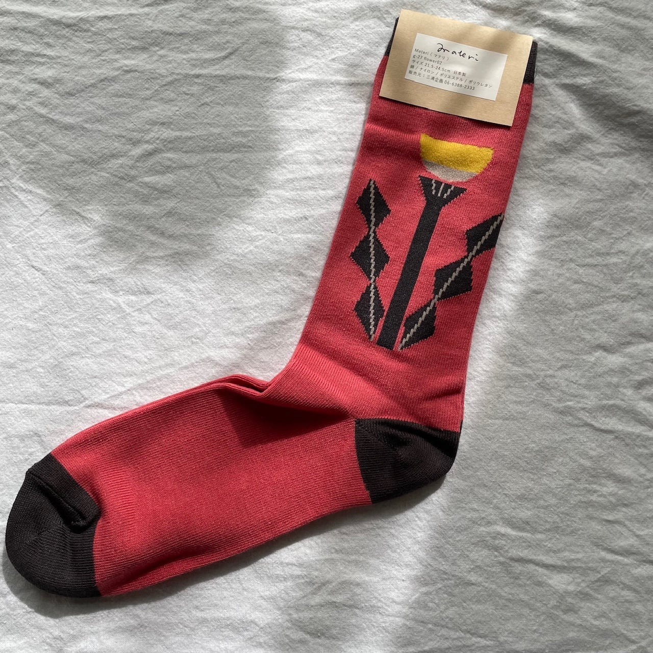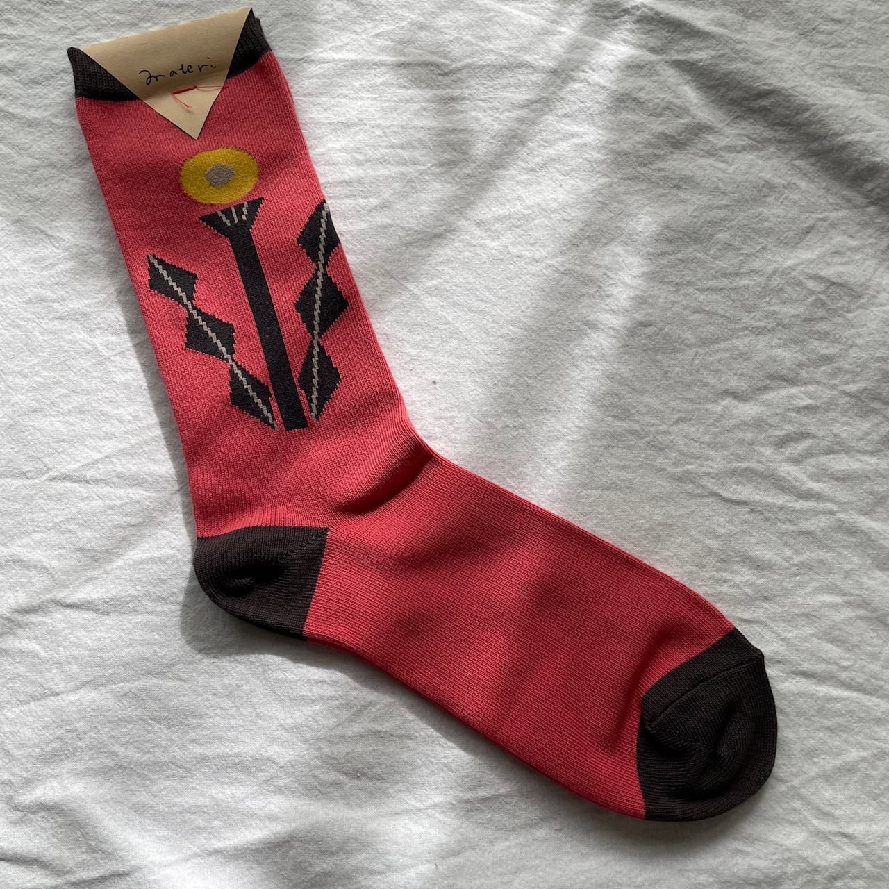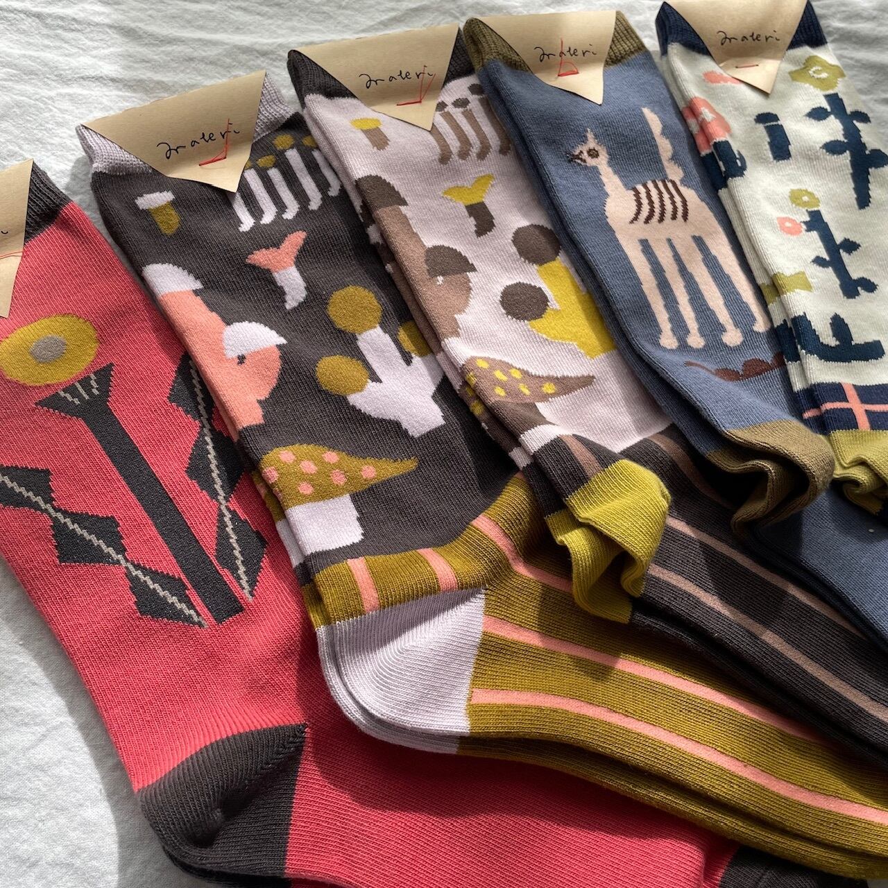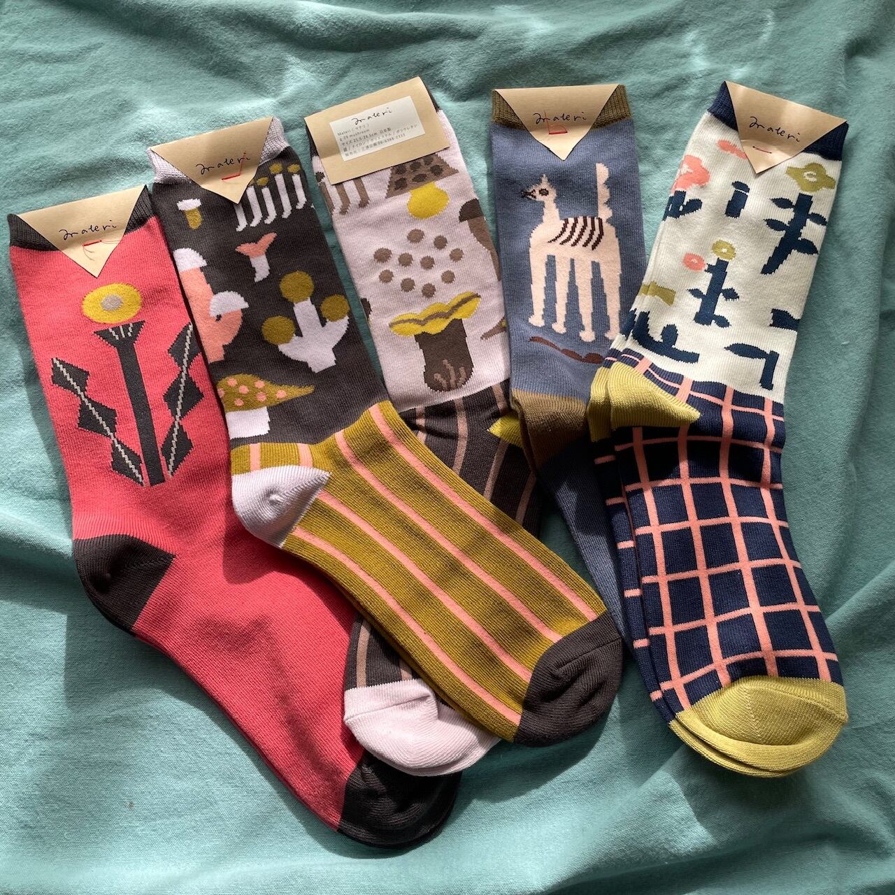 身の回りにあるモチーフや人や生き物などを素朴にゆるく絵にしたり、デザインされているイラストレーターのますたにあやこさんが描いたお花柄の靴下をセレクトしました。