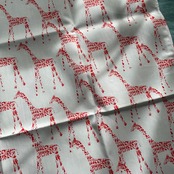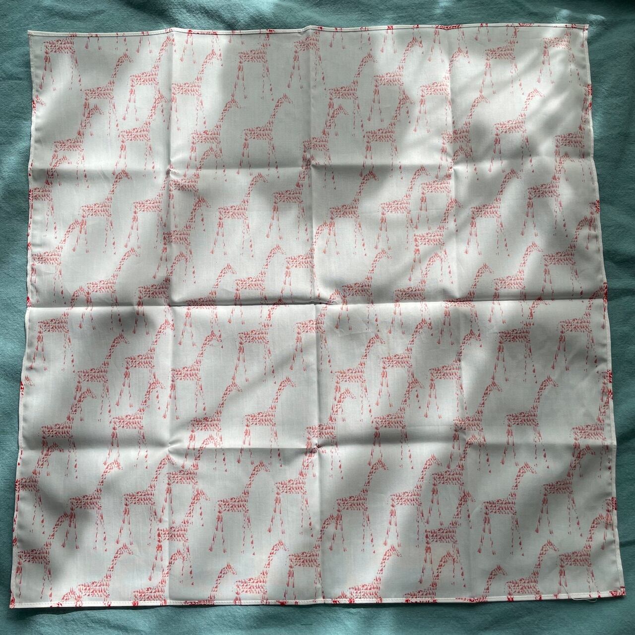 このハンカチは、50ブロードを使用して作られたハンカチで、しっかりとした生地に赤が目を惹くキリンがプリントされています。