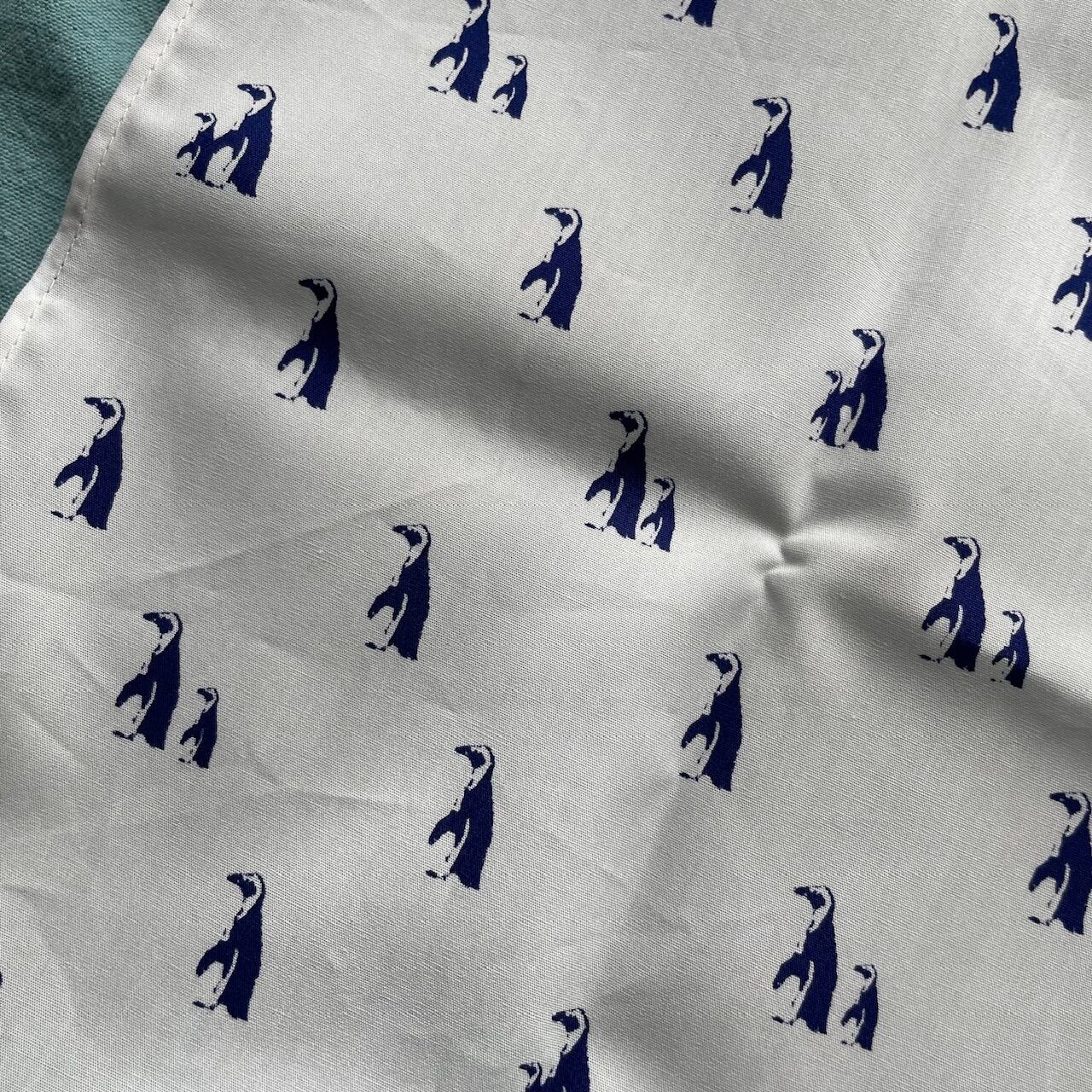 このハンカチは、50ブロードを使用して作られたハンカチで、しっかりとした生地に美しいネイビーのペンギンとその親子がプリントされています。