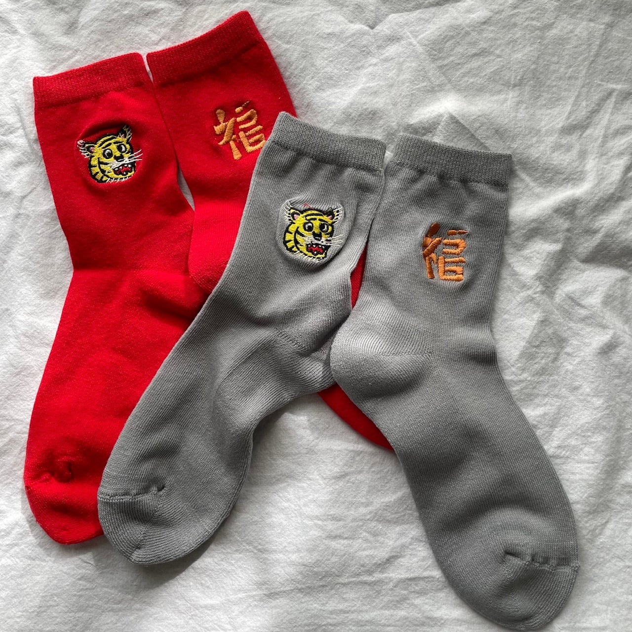 お笑い芸人でありデザイナーでもある、ネゴシックス氏がデザインした「虎」と「福」が刺繍されたアシンメトリーソックスをセレクトしました。