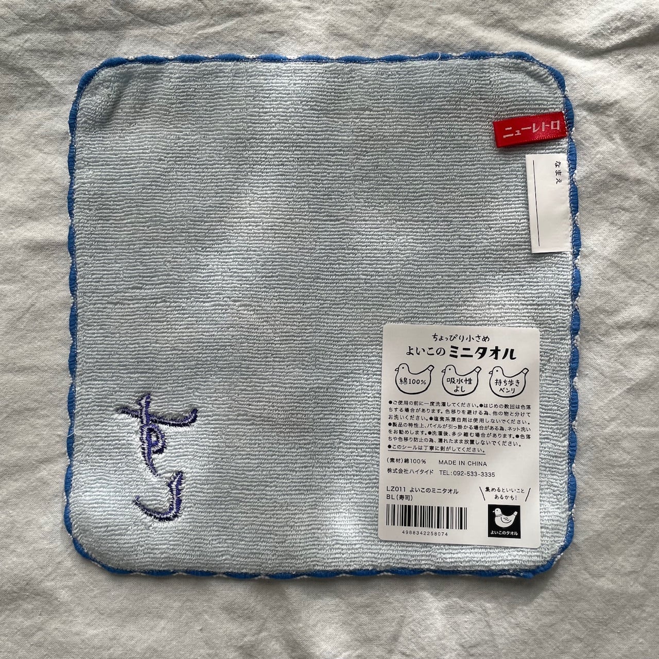 今回はニューレトロさんのよいこのミニタオルシリーズから「すし」の刺繍が存在感抜群のお寿司柄のハンカチをセレクトしました。