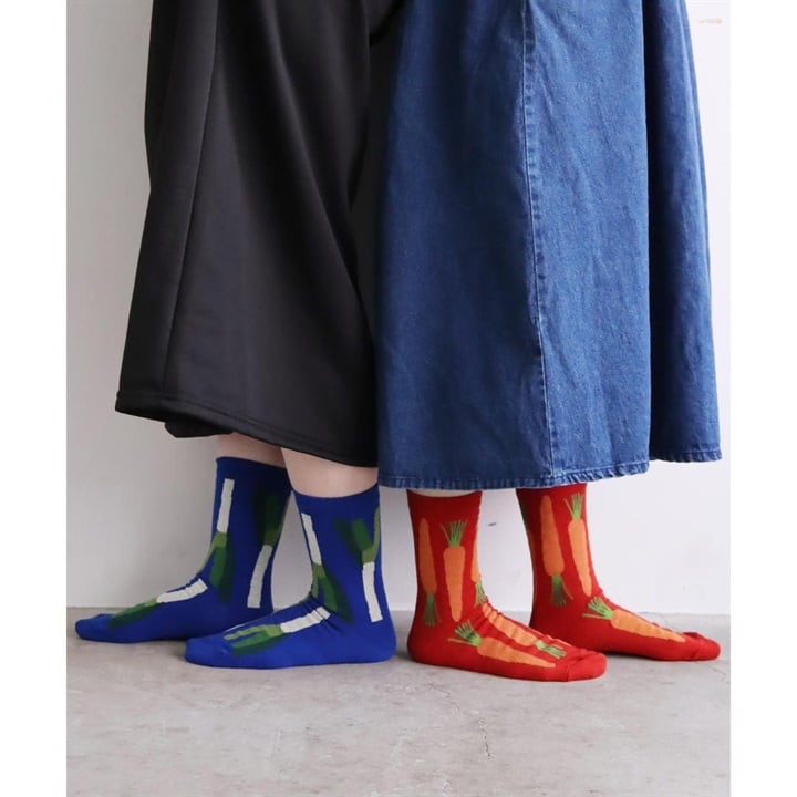 ねぎと人参が描かれた靴下は「洋風」の色合いに仕上がっていて、意外にも(?)合わせやすい柄と色味。