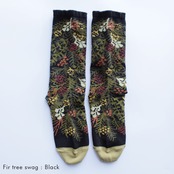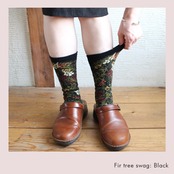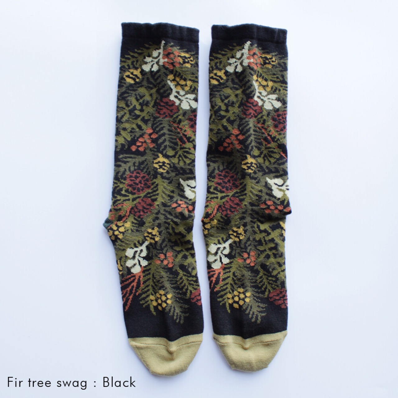 モミの木のスワッグは、『壁飾り』を意味するスワッグはヨーロッパでは古くから魔除けや、幸福を呼ぶために飾る習慣があったようです。靴下では常緑樹で冬場でも緑を絶やさないことから‘永遠の命・生命力の象徴’とされるモミの木や杉、再生のシンボルのユーカリなど自然の力強さを感じる植物たちが描かれています。本物のスワッグのように壁に飾っても存在感のあるデザインです。