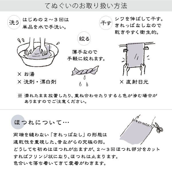 ※手ぬぐいは切りっぱなしなので、最初のうちはほつれますが、何度か洗濯するうちおさまります。