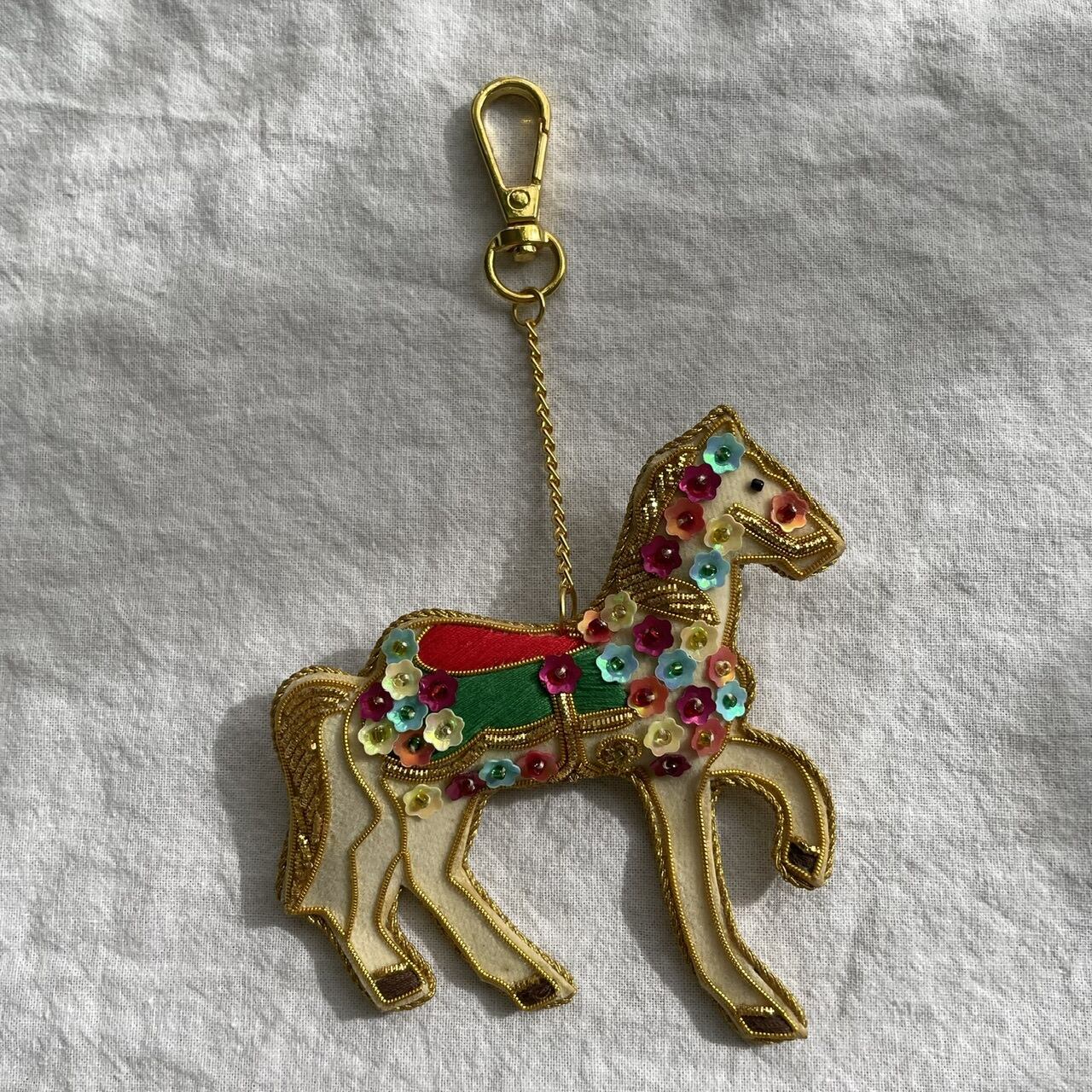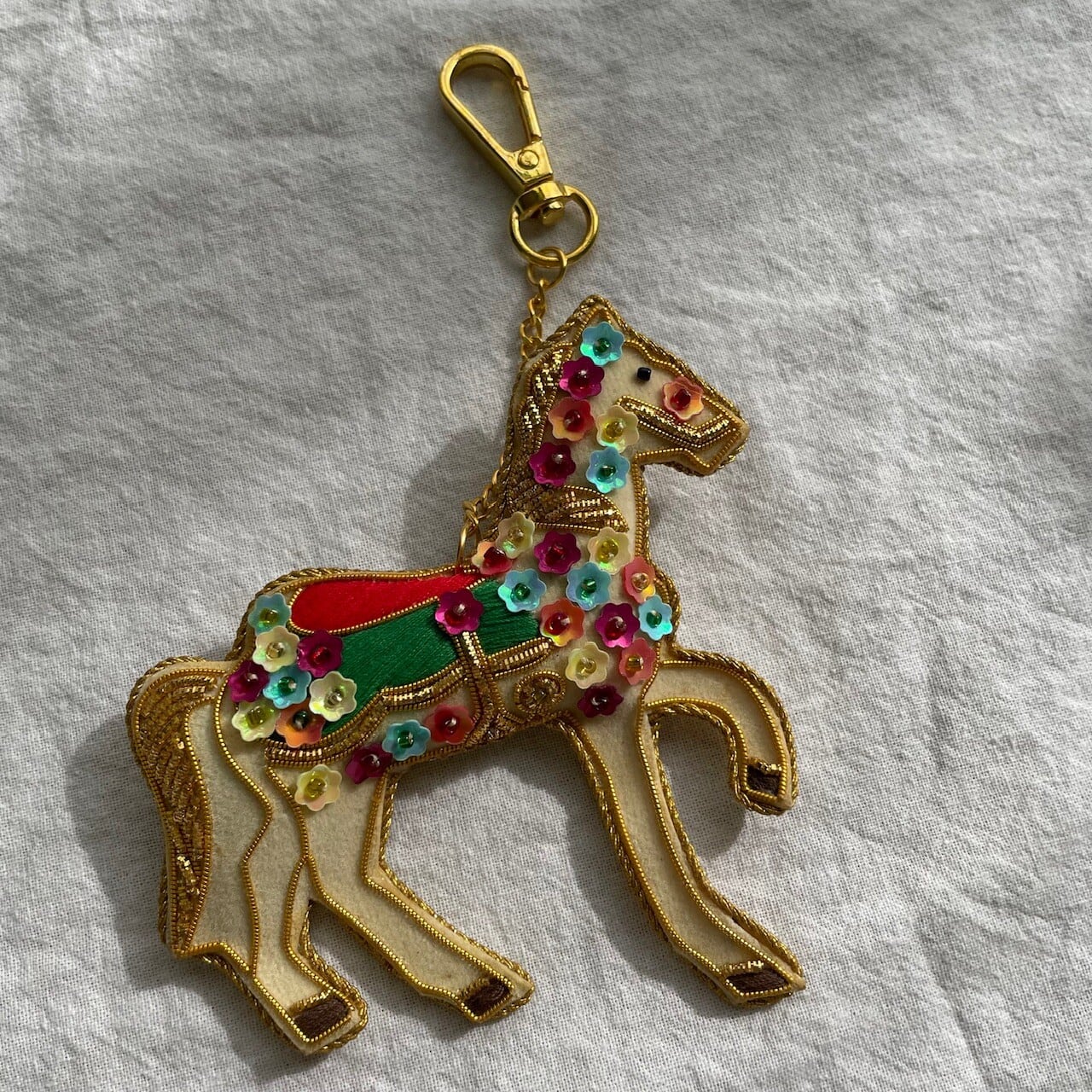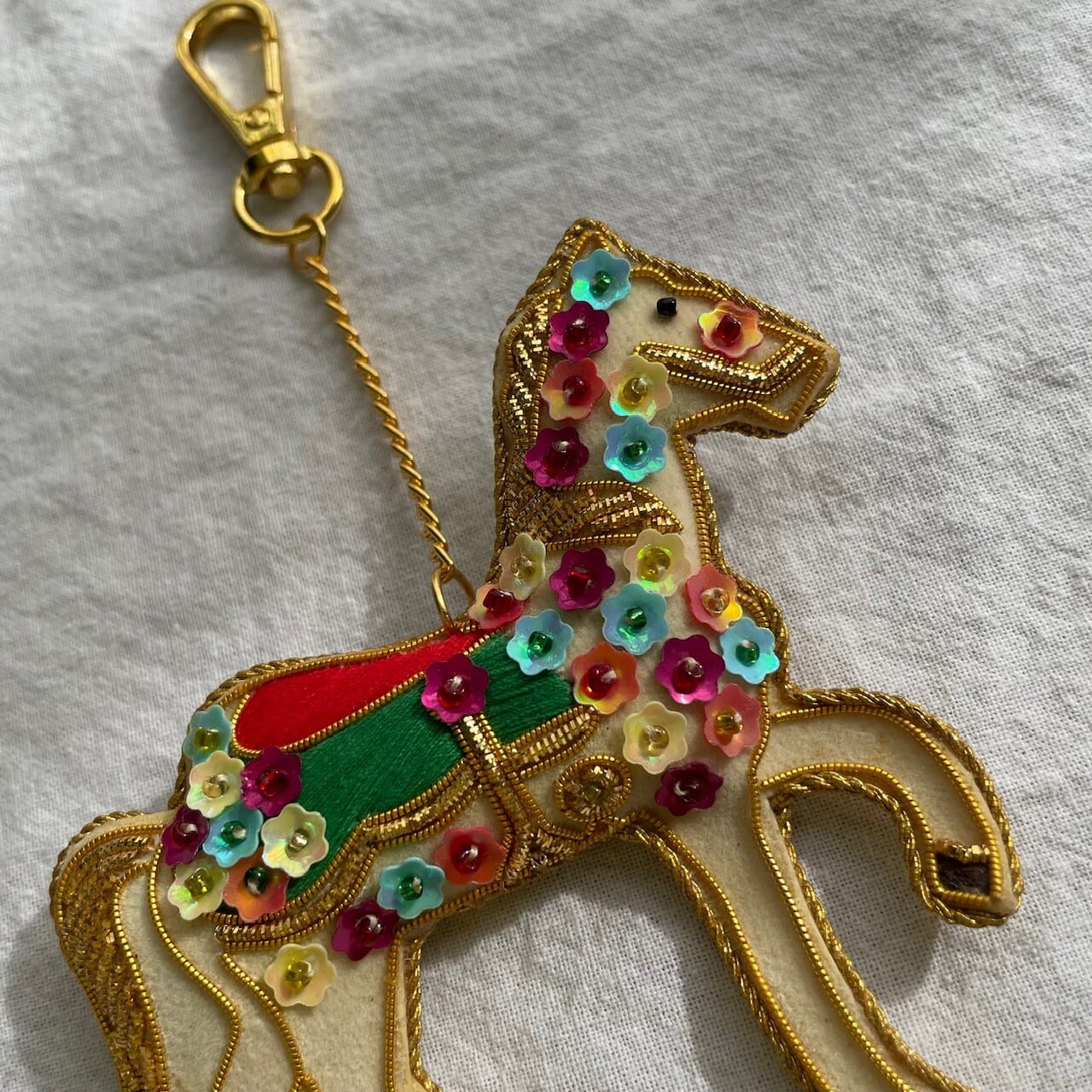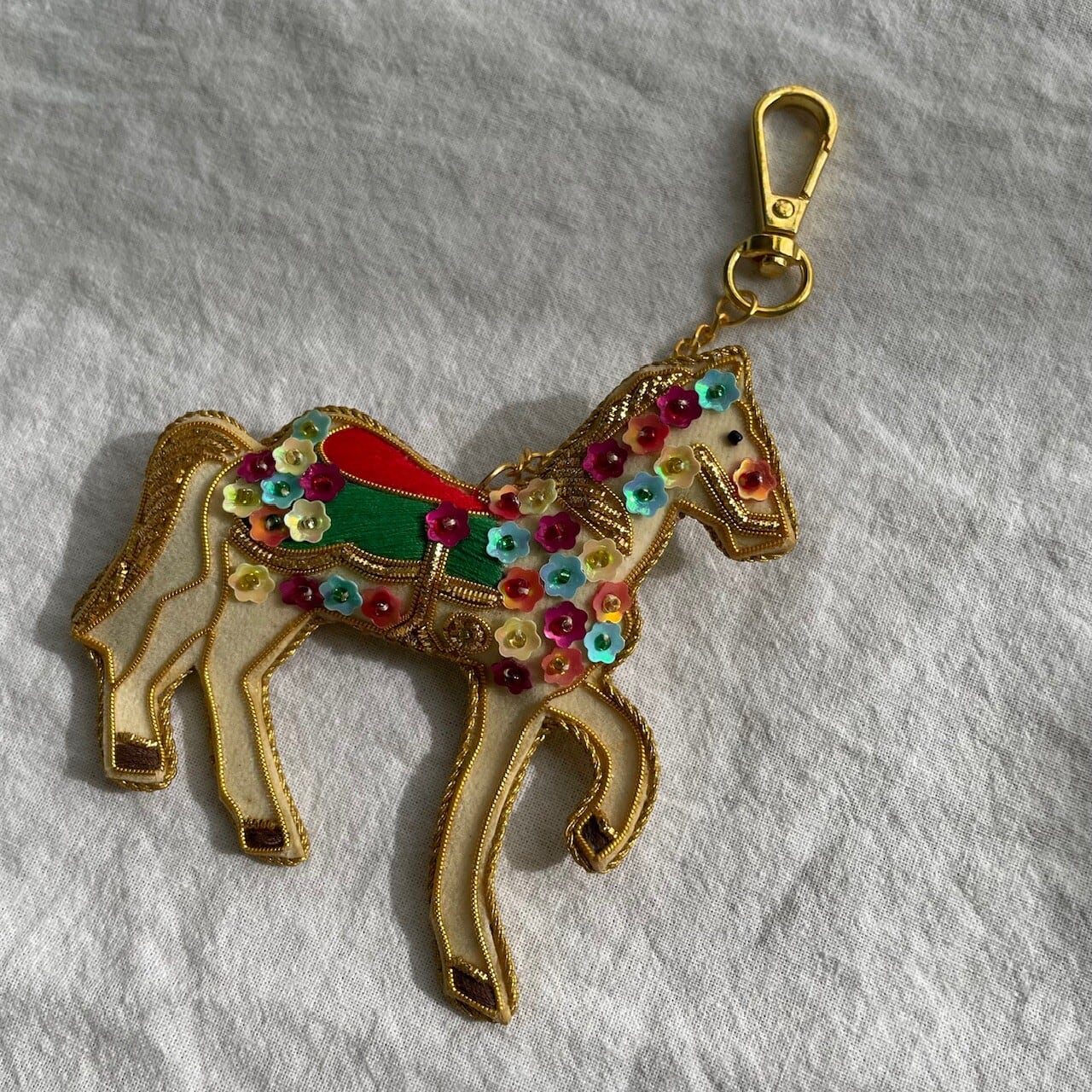 白いお馬さんに、キラキラかわいいスパンコールがおめかし刺繍されたキーホルダーをセレクトしました。これは、ザリ刺繍と言って、インドのインドの伝統的な刺繍方法が施されたキーホルダーです。