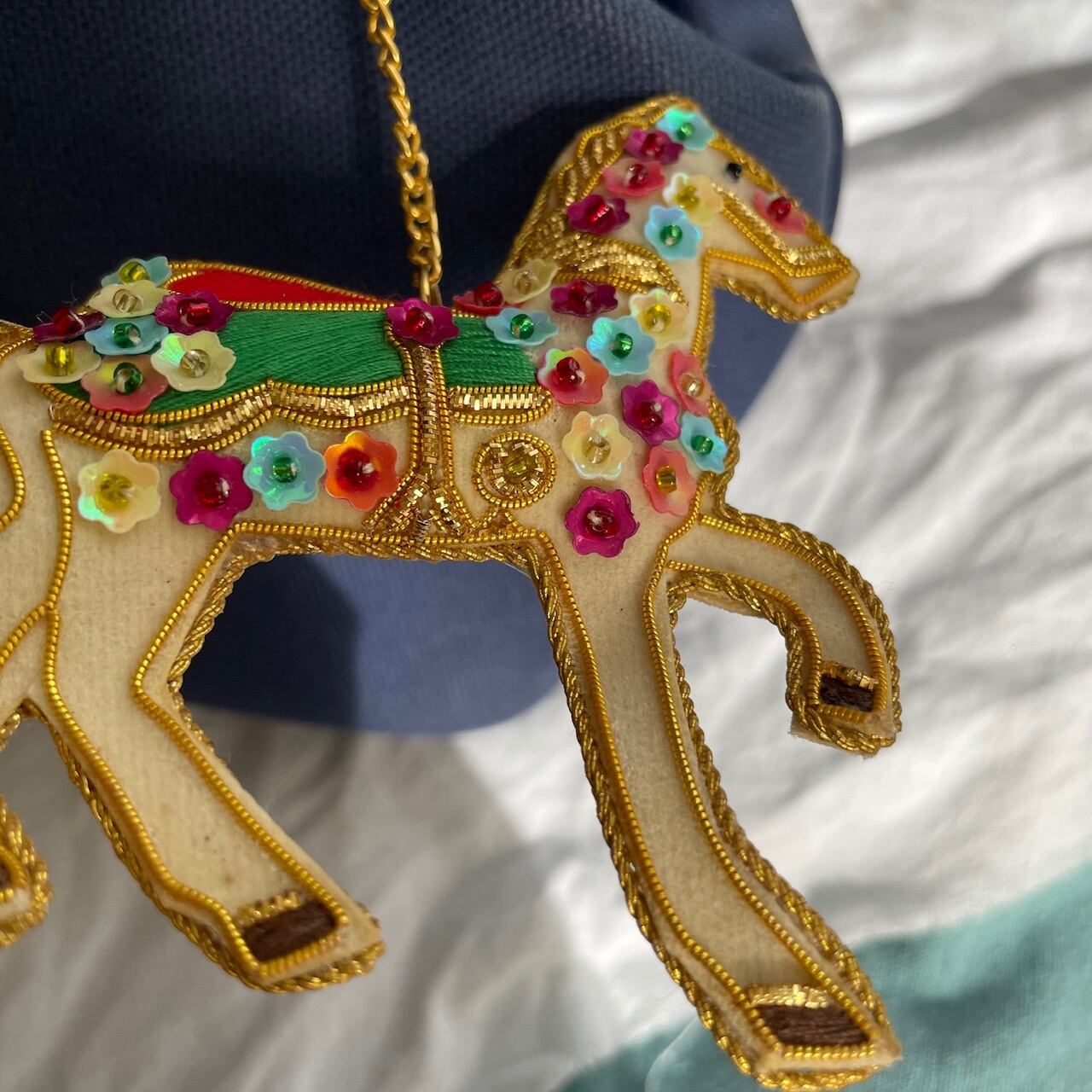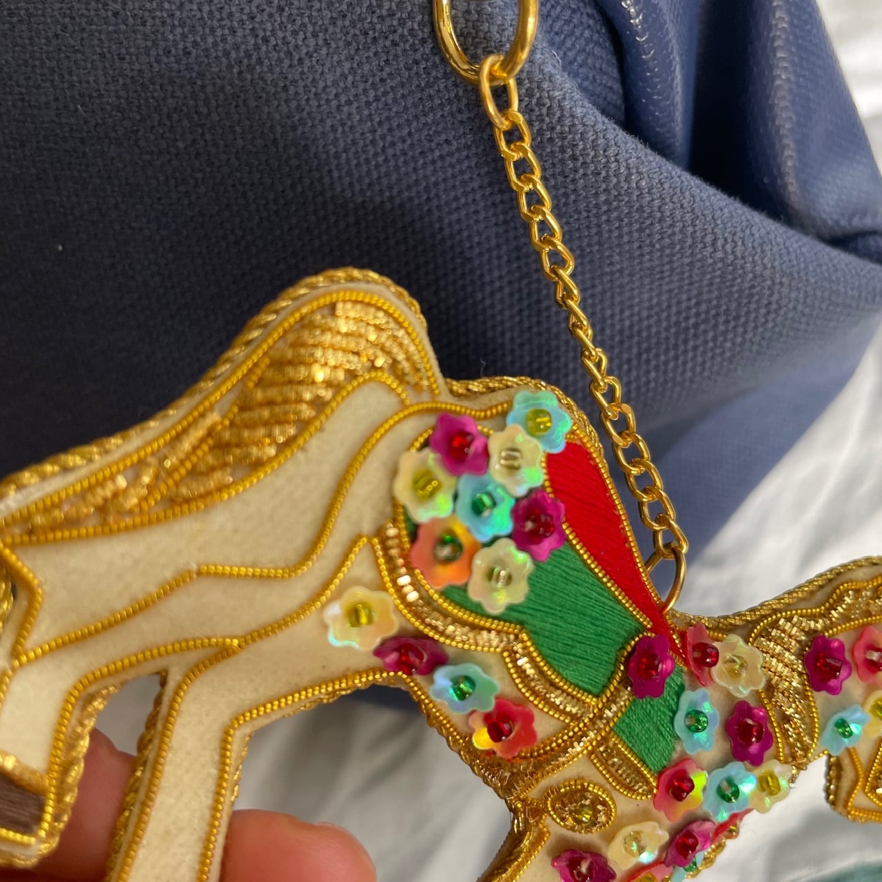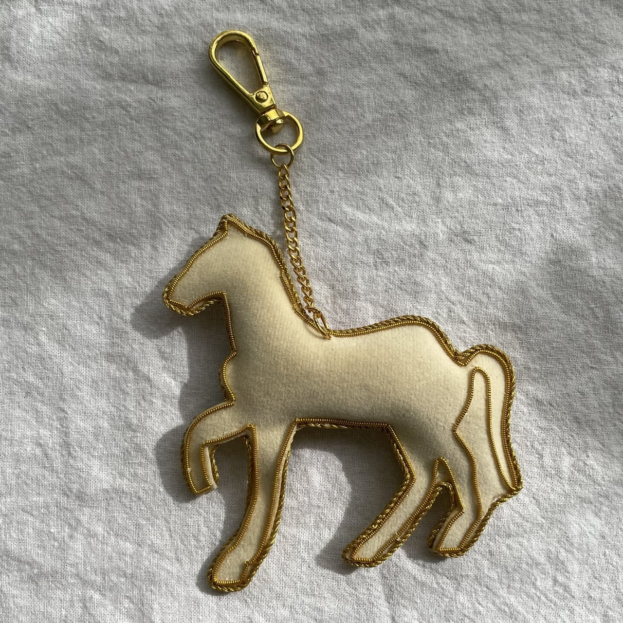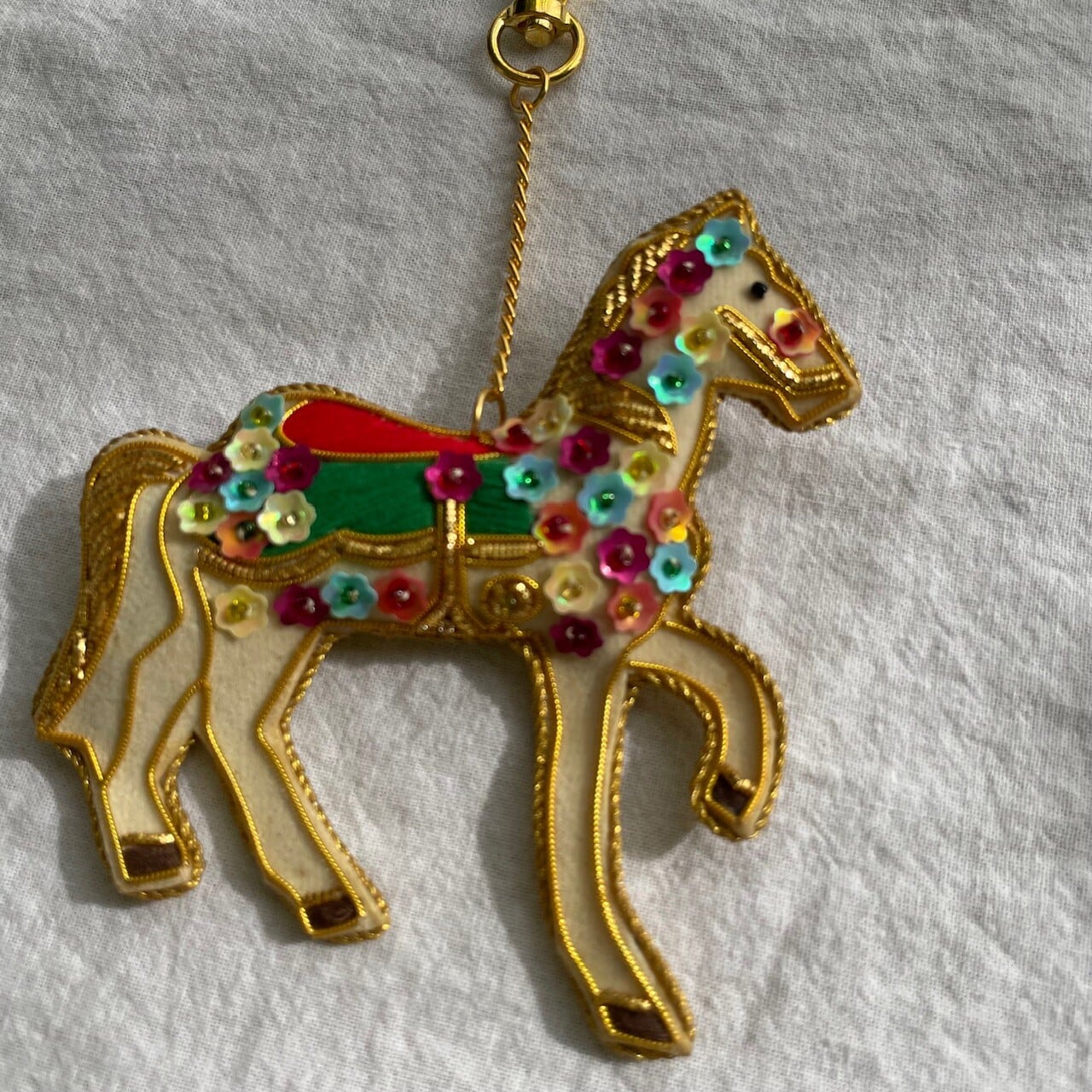 白いお馬さんに、キラキラかわいいスパンコールがおめかし刺繍されたキーホルダーをセレクトしました。これは、ザリ刺繍と言って、インドのインドの伝統的な刺繍方法が施されたキーホルダーです。