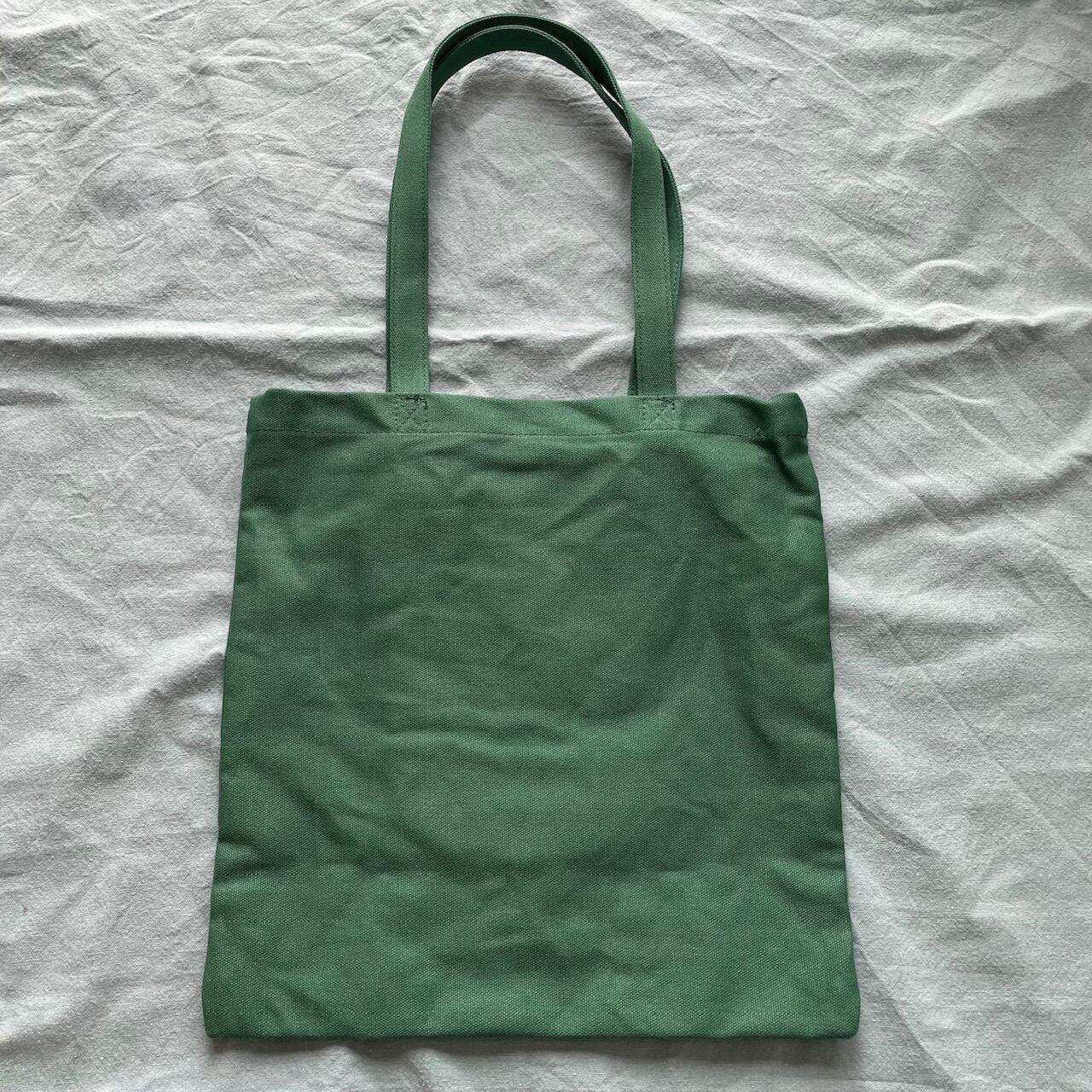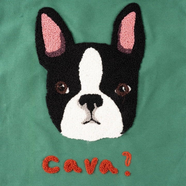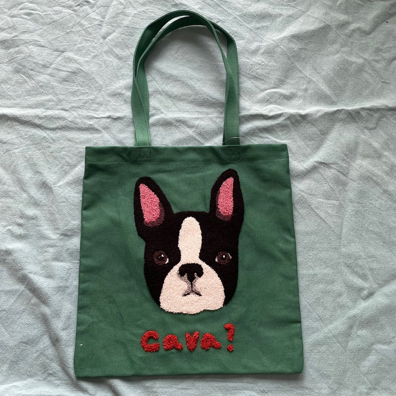 おしゃれなグリーンの生地にフレンチブルドッグの刺繍が映えるバッグに仕上がっています。