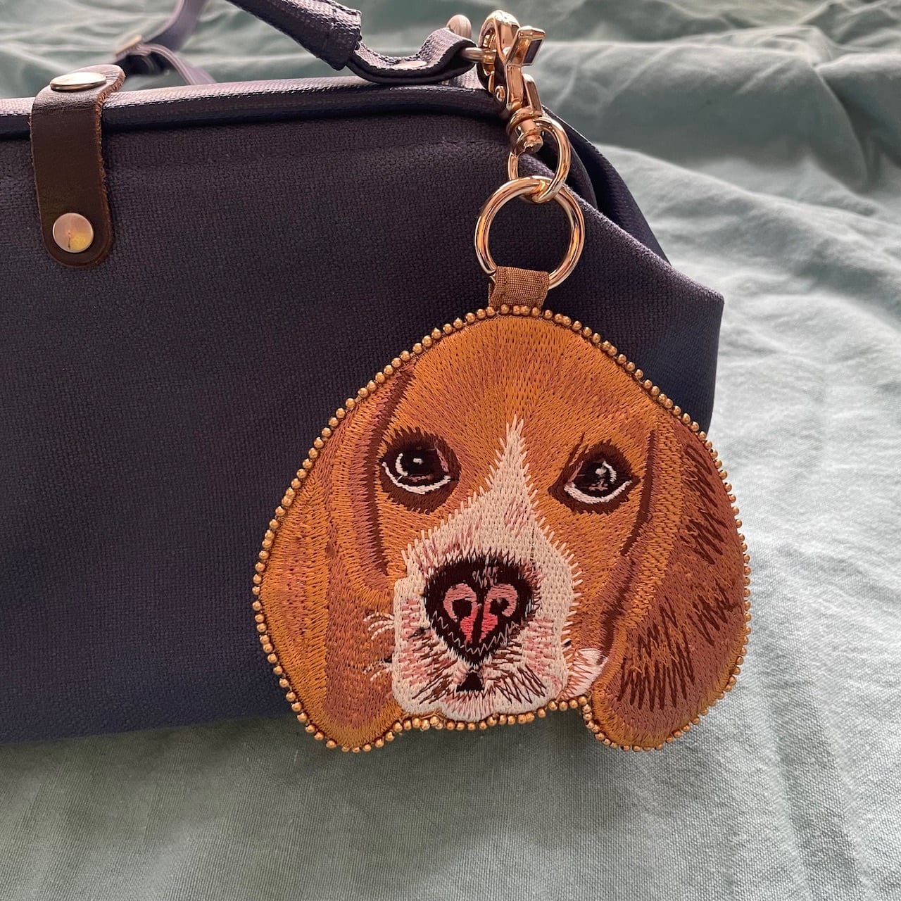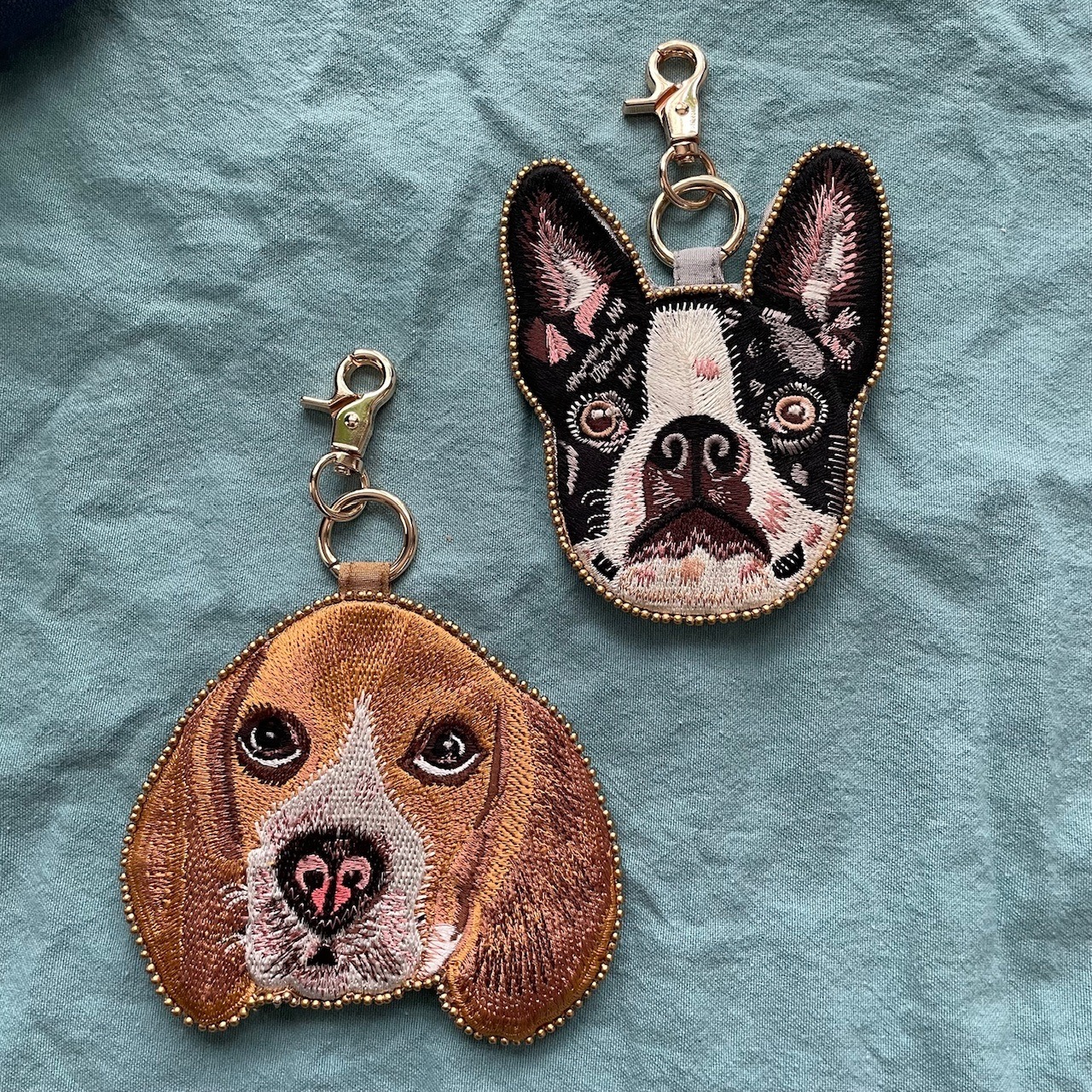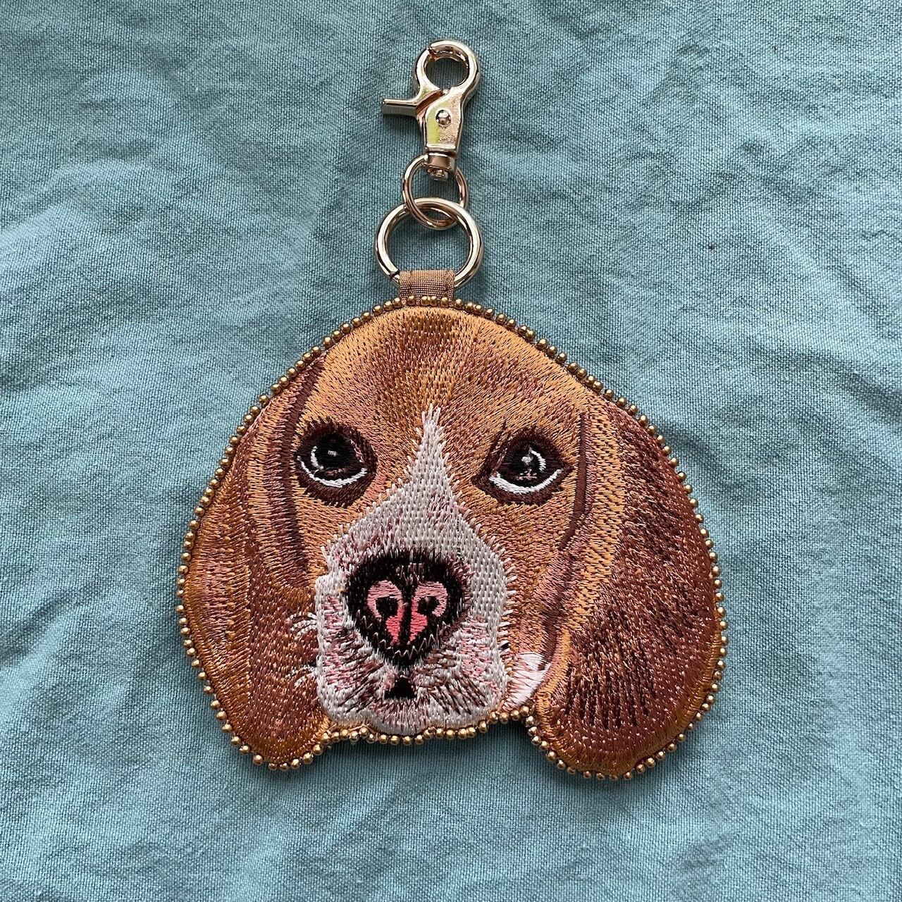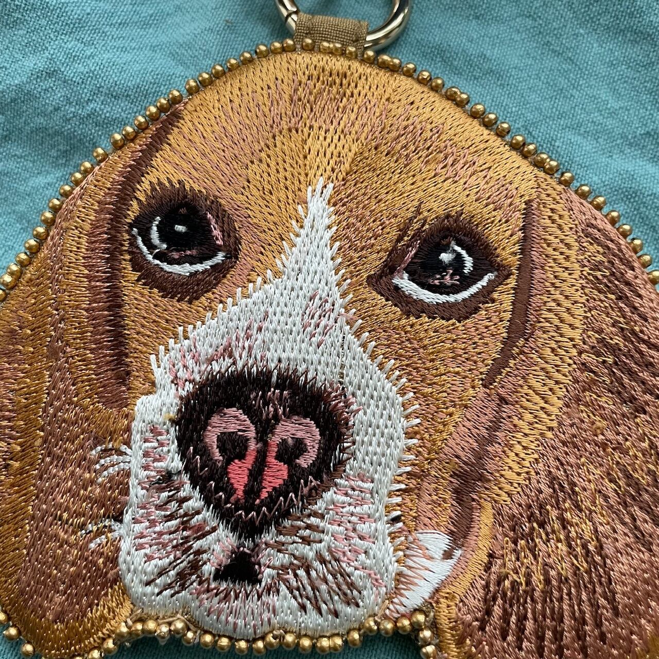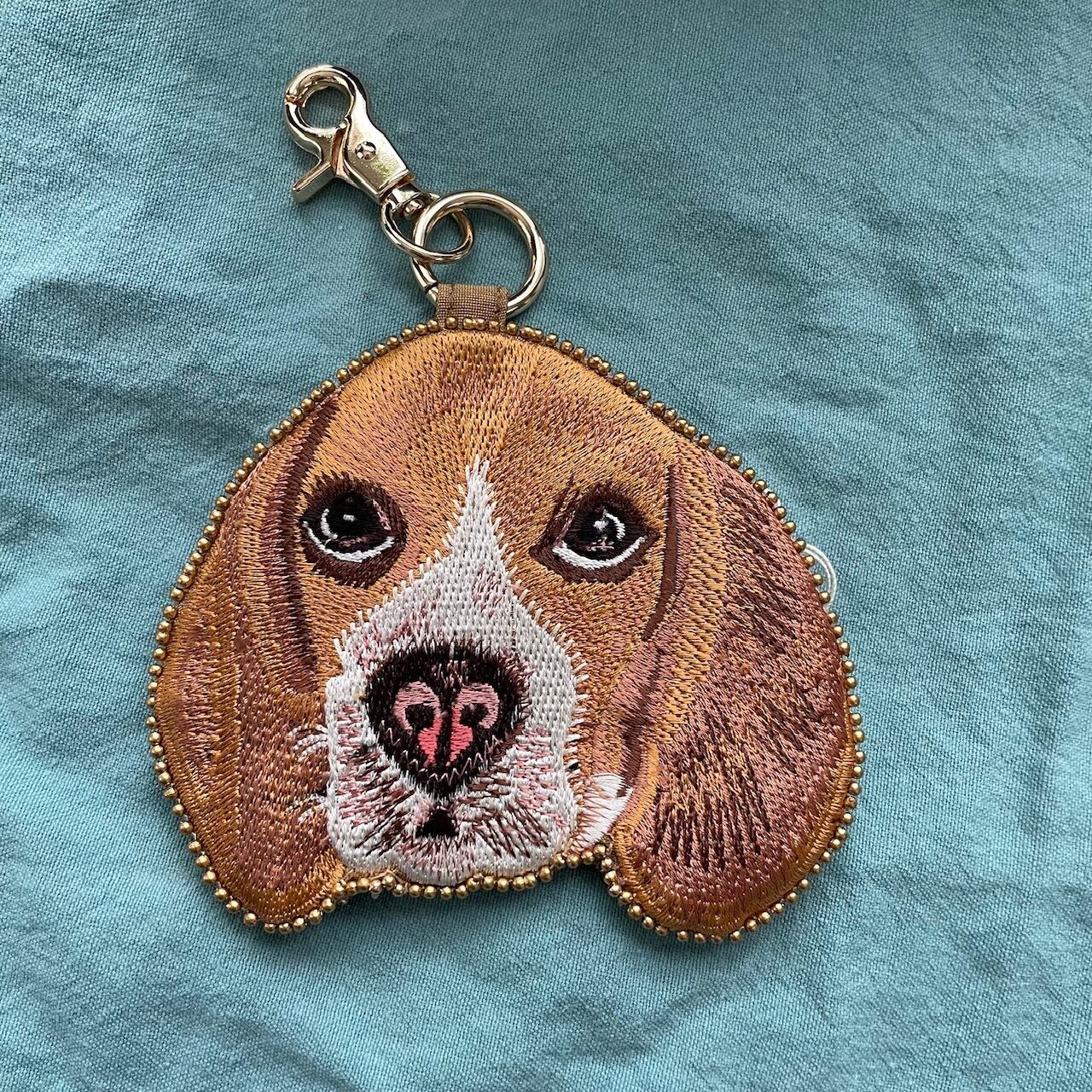 ビーグルちゃんの可愛らしいお顔が、細やかで丁寧な刺繍とビーズで再現されたキーポーチをセレクトしました。サイズ感は手のひらより少し大きめくらい。精緻な刺繍とビーグルちゃんの表情がめちゃめちゃ可愛い!
