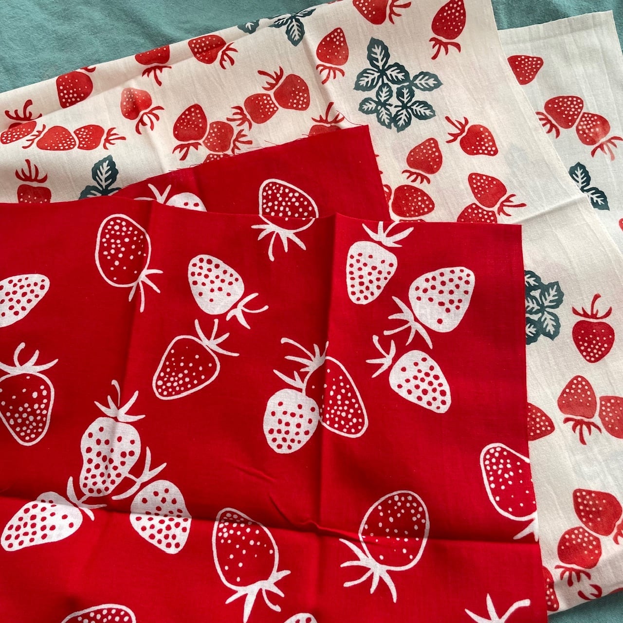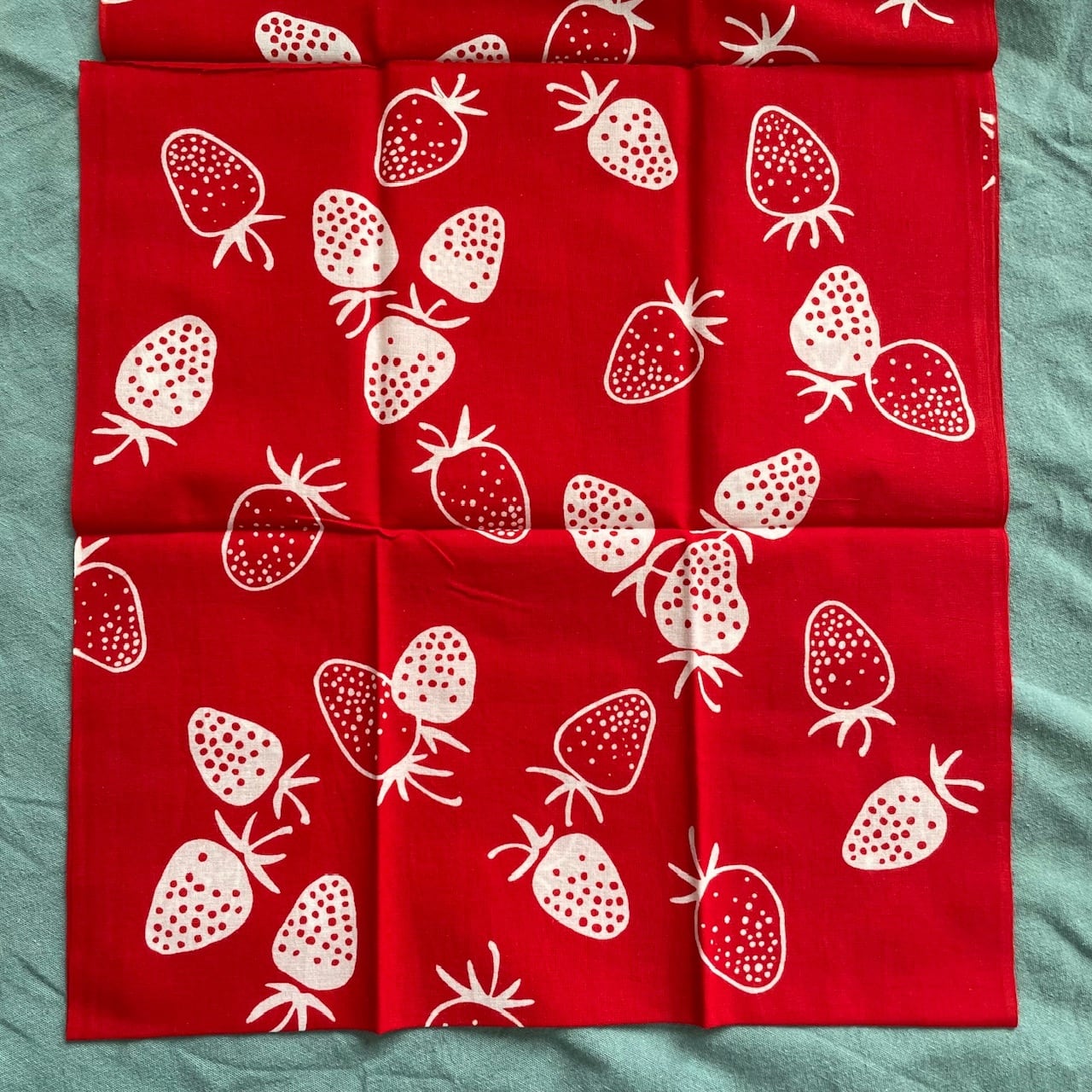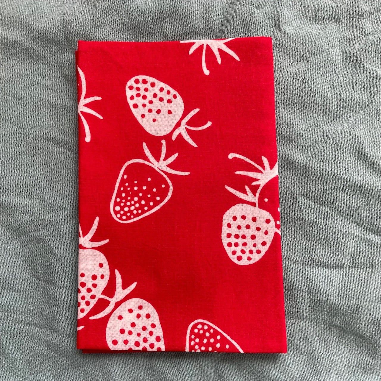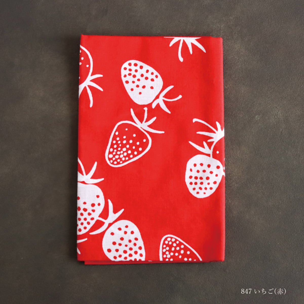 赤い生地に白抜きのいちごたち。シンプルなデザインのいちごが可愛らしく飽きがこない1枚。