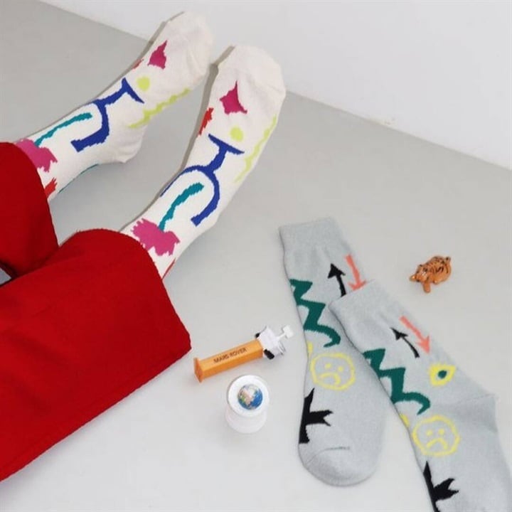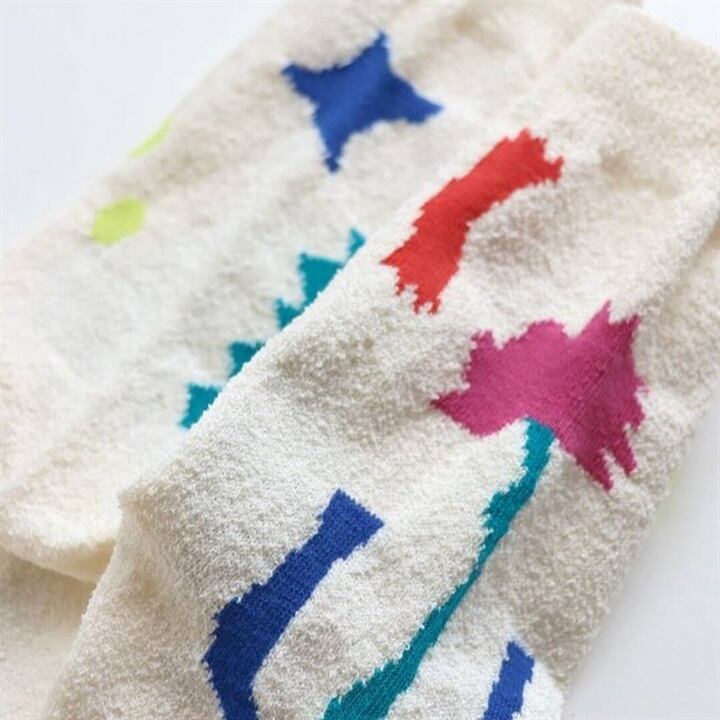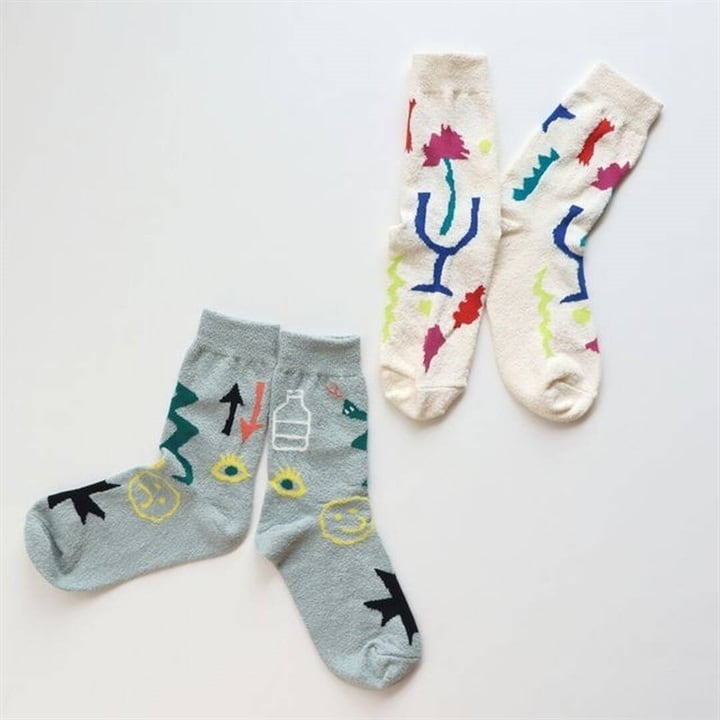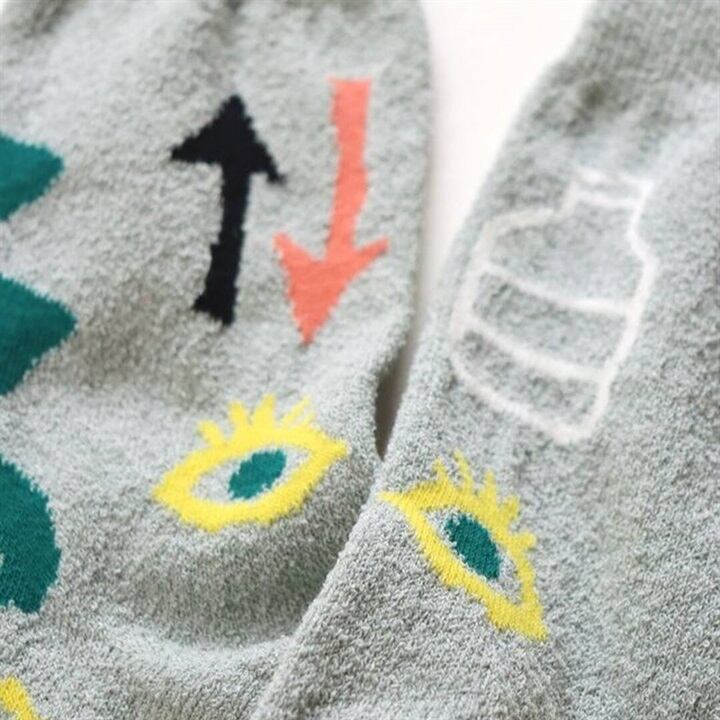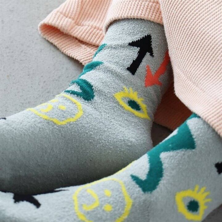 白地にカラフルな花のような絵がデザインされた靴下と、グレーにお目目やヘビなどのちょっとおもしろモチーフがデザインされた靴下は、どちらも可愛くて楽しい。履くだけで気分が上がりそうなお洒落なデザインです。
