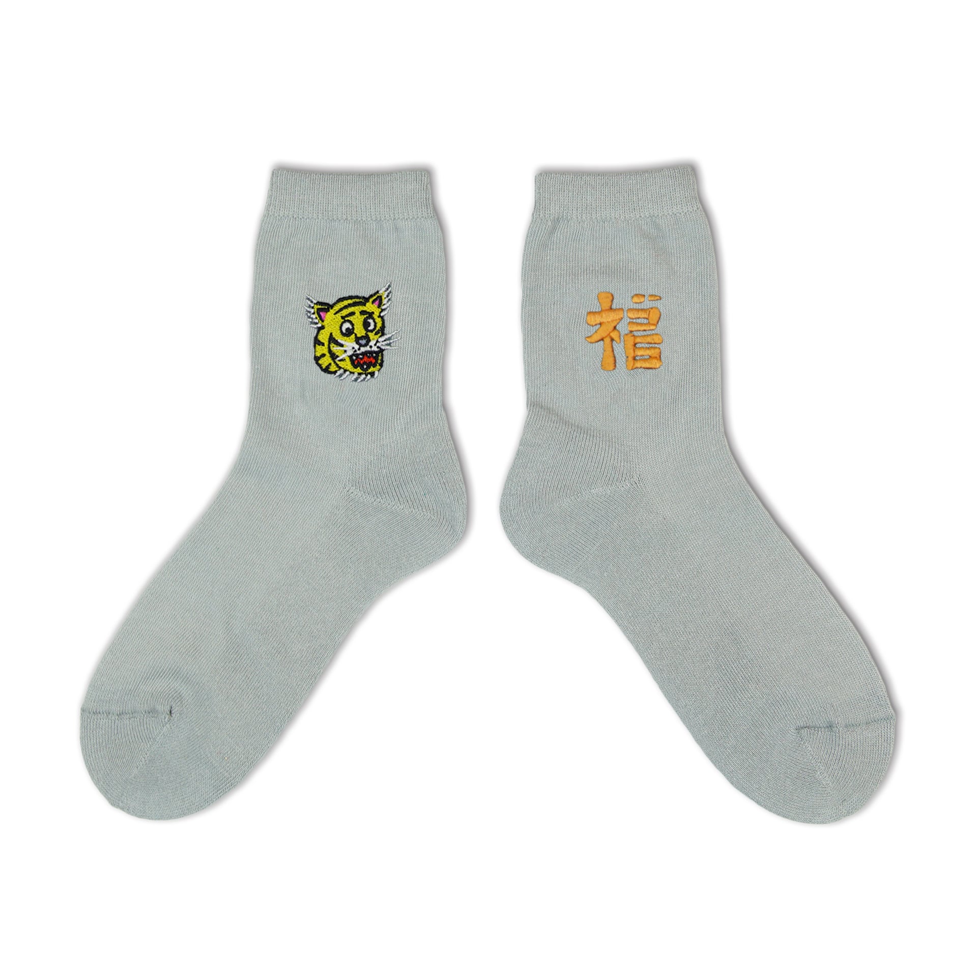 お笑い芸人でありデザイナーでもある、ネゴシックス氏がデザインした「虎」と「福」が刺繍されたアシンメトリーソックス。
