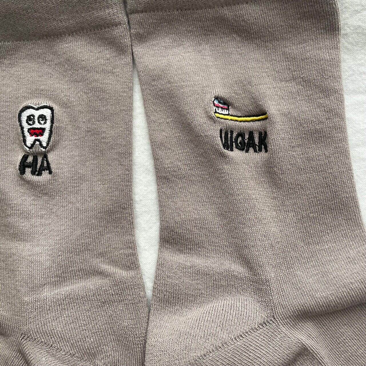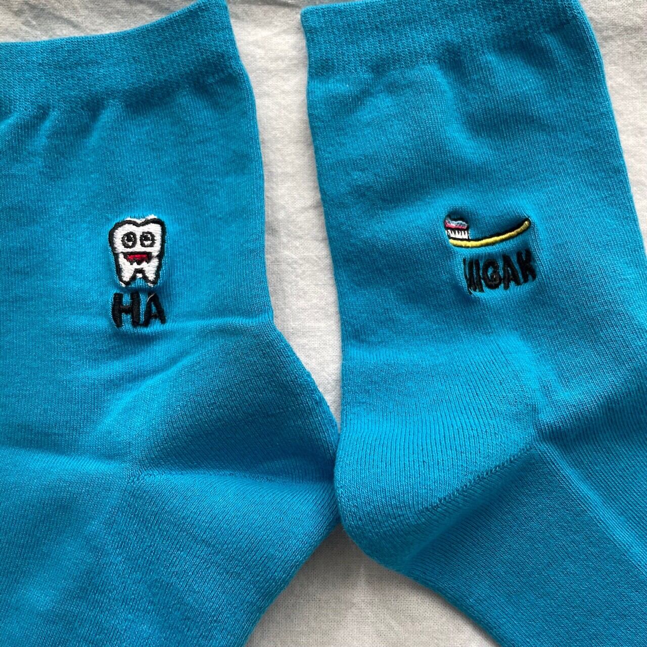 「歯」のモチーフって中々ないなと思いつつ、おもしろ顔の「歯」と「MIGAKI」と書かれたブラシ。細かい刺繍のモチーフと、アシンメトリーな感じがとても楽しく、お洒落なメンズも喜んでくれそうなデザインです。
