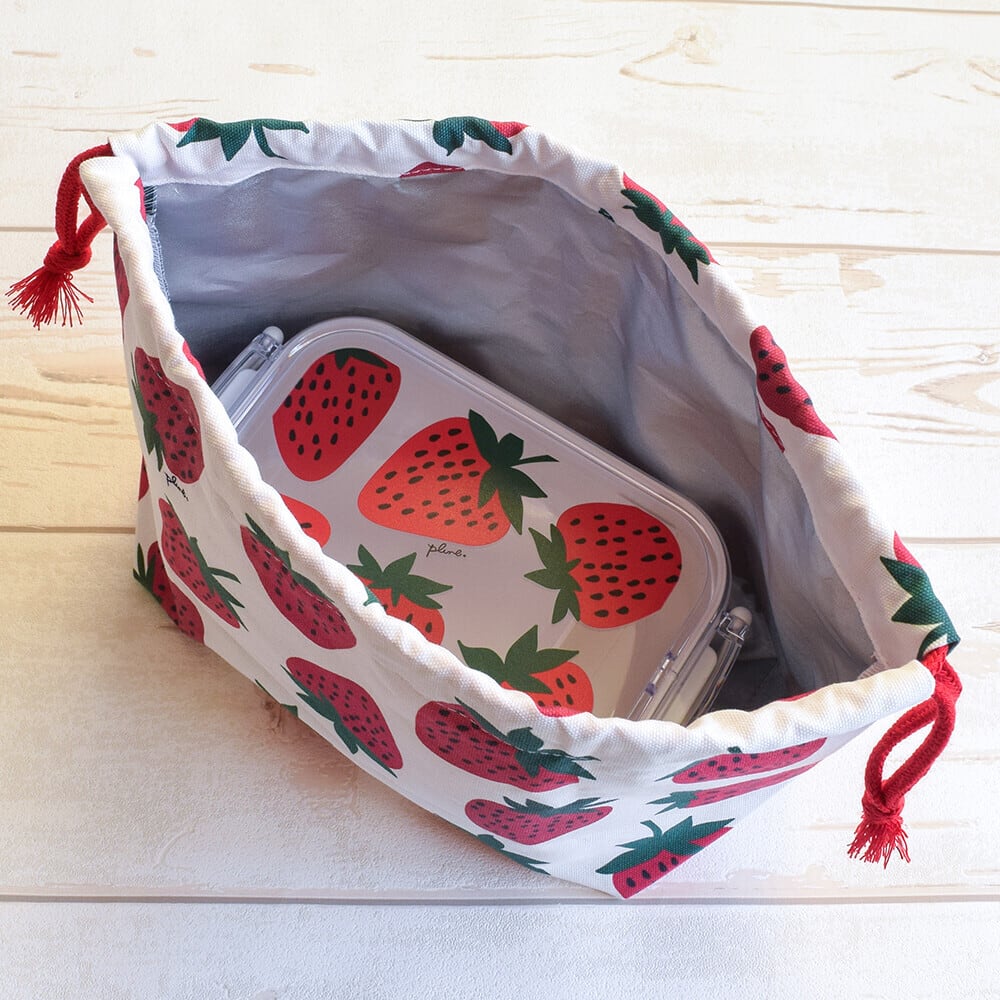大きくて美味しそうないちごがたっぷり描かれたPlue.デザインのランチ巾着をセレクトしました。いちご柄がとってもインパクトがあって可愛い!