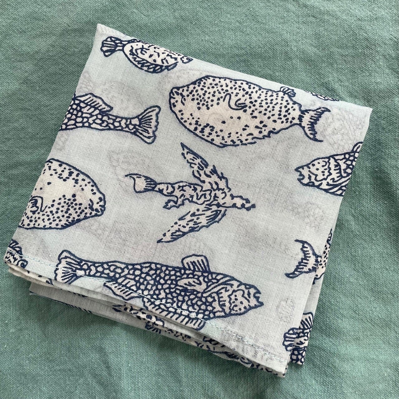 お魚模様の大判ハンカチ インド ブロックプリント お弁当包み スカーフ さかな 綿100% プレゼント