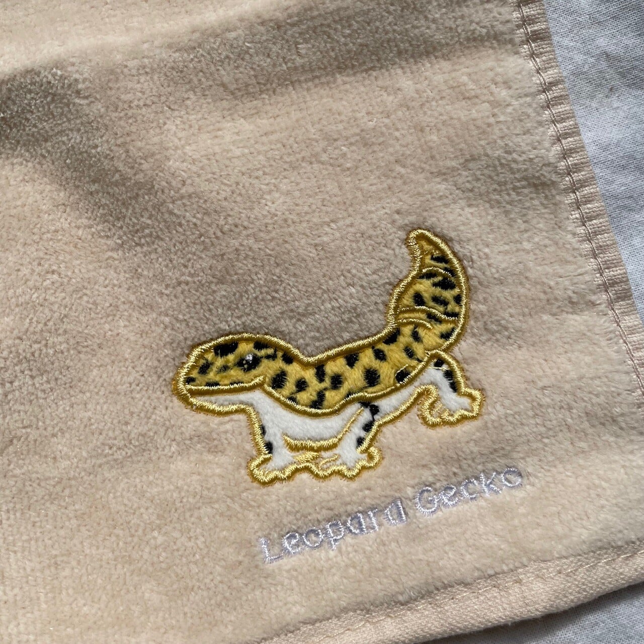 優しい黄色がかった生地に、レオパードゲッコーの刺繍。見るたびに「可愛い」と思ってしまいます(笑)。