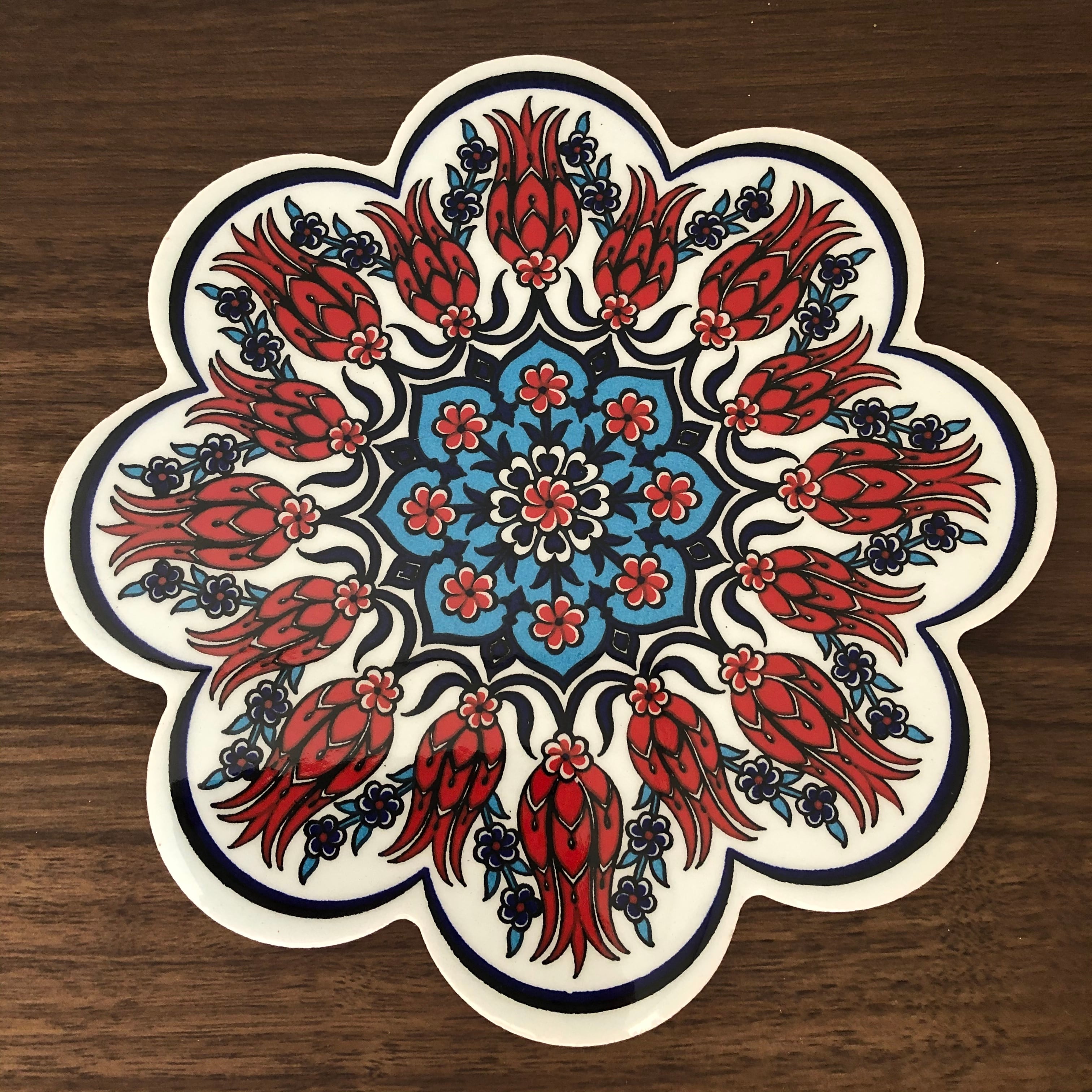 今回は赤い花柄が強烈な印象を残すデザインのトルコ製鍋敷きのご紹介です。