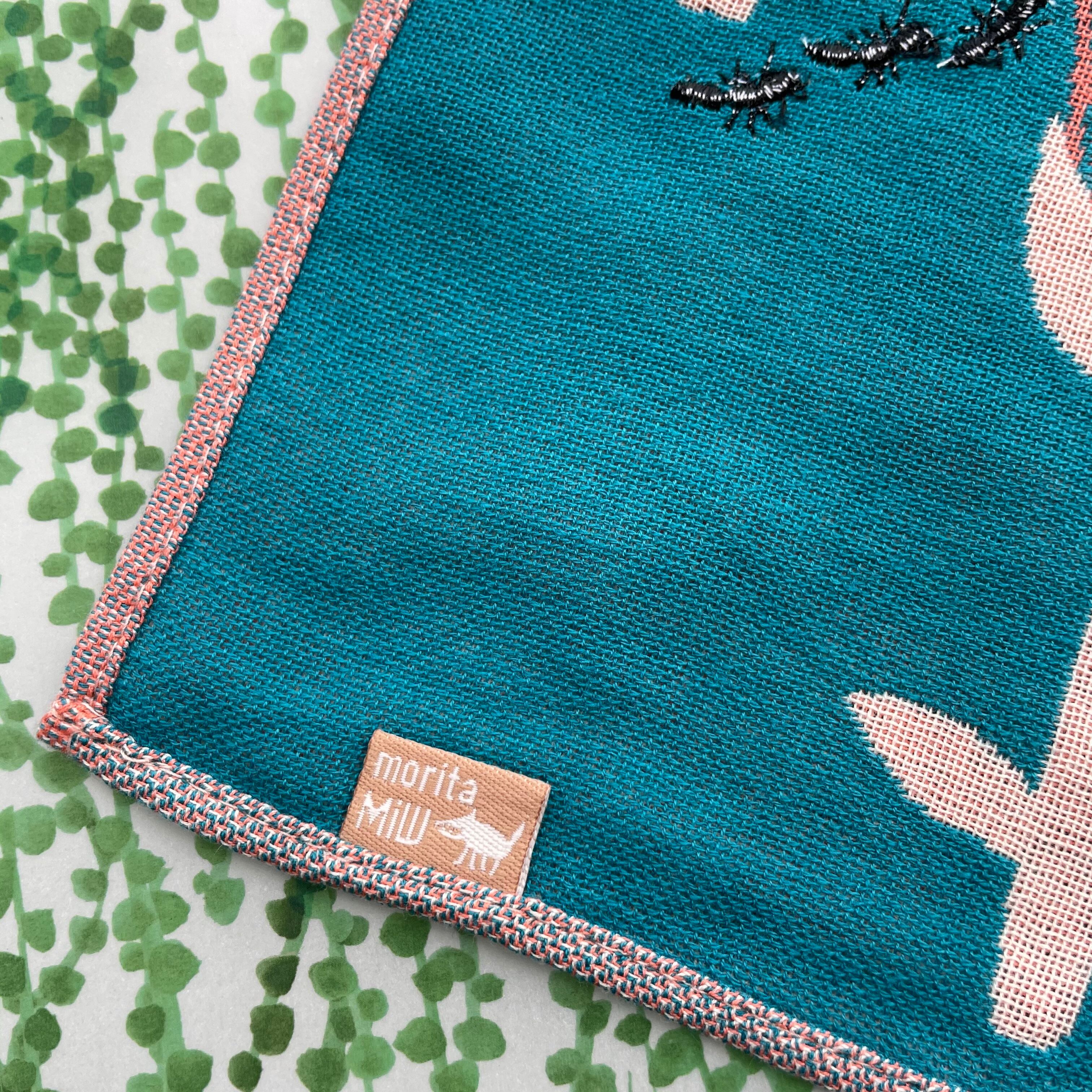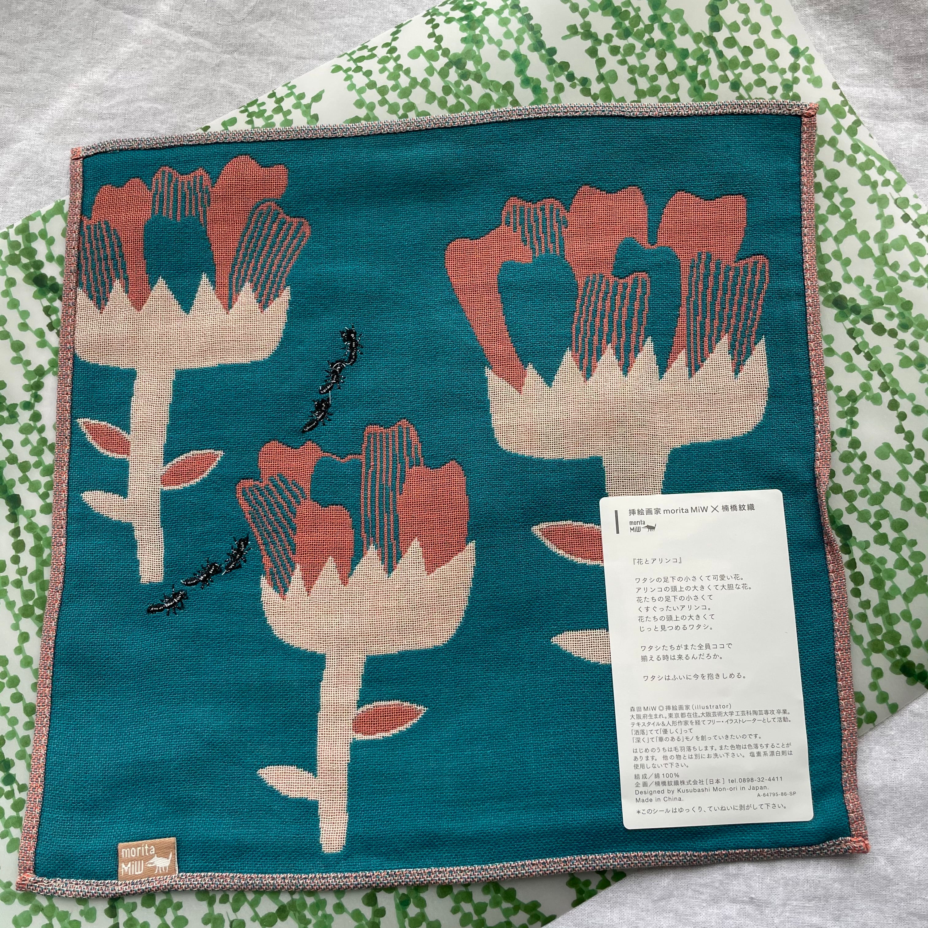 森田MiWさんの使いやすくて可愛い人気シリーズからふわふわ優しいピンクが春を思わせてくれる「花とアリンコ」の3重ガーゼハンカチです。