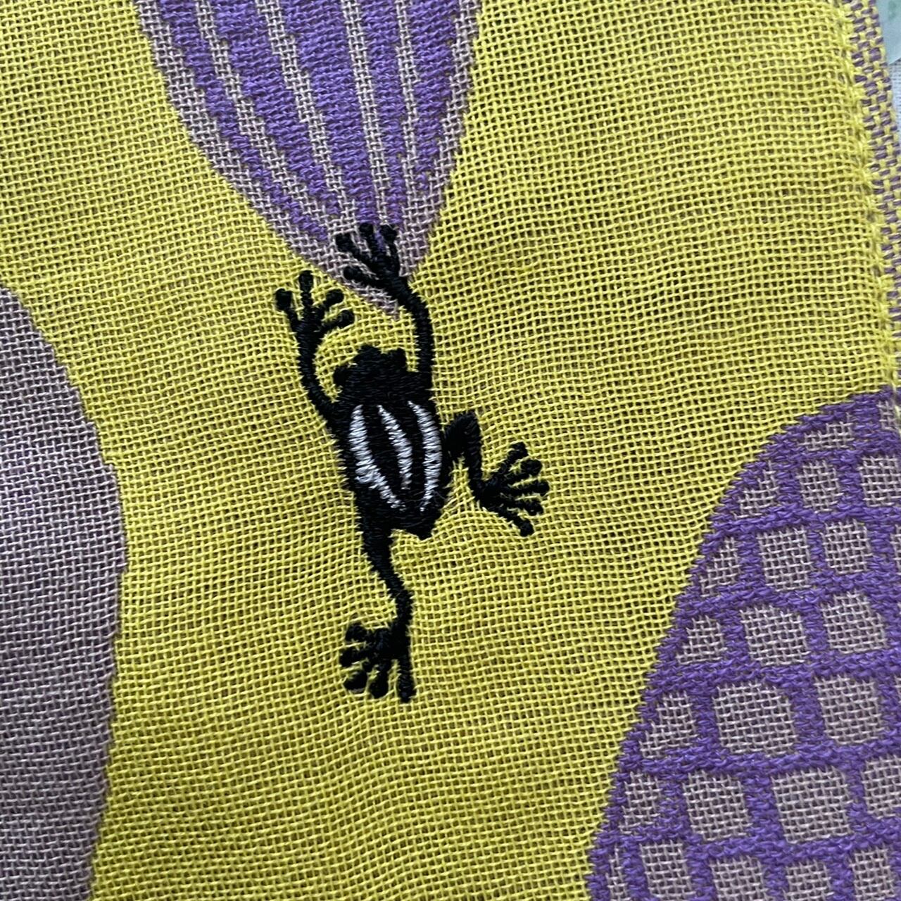 そしてカエルさんの跳ねている姿を精巧に表現している刺繍。手足に元気の良さが表れていますよね♪