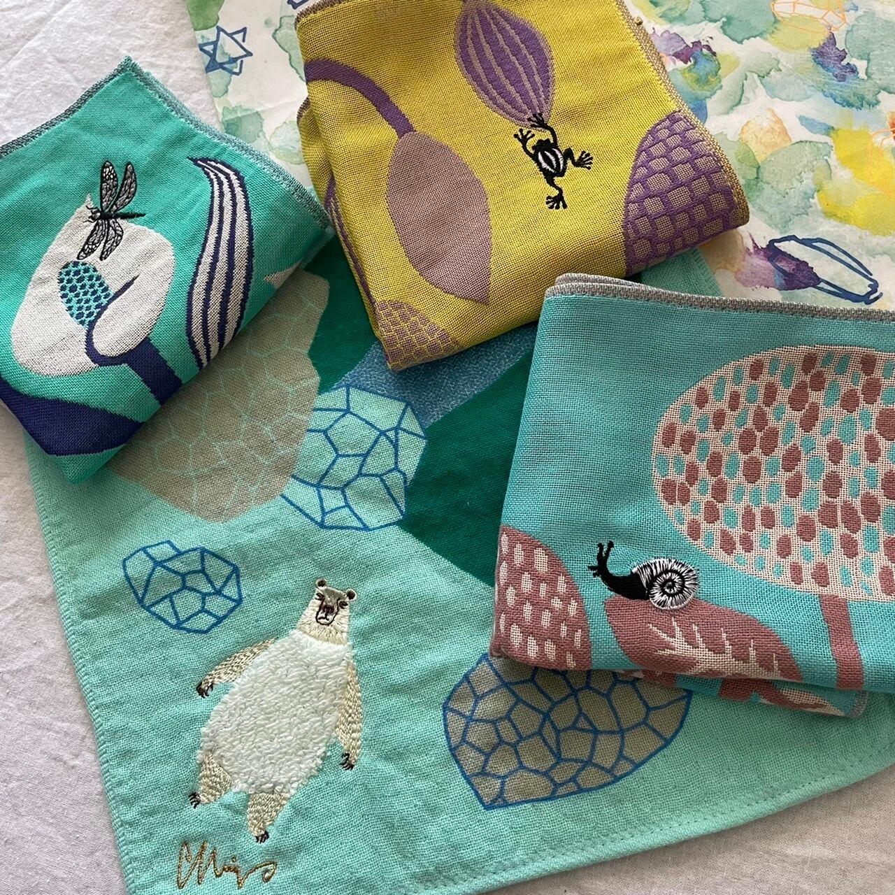 人気シリーズのちいさなポケットハンカチ「今のところオタマガエル」を入荷して以来、森田MiWさんの描くカエルのとりこになってしまいました。今回は軽くて薄くて吸水性抜群の3重ガーゼハンカチから「花とカエル」をセレクト。