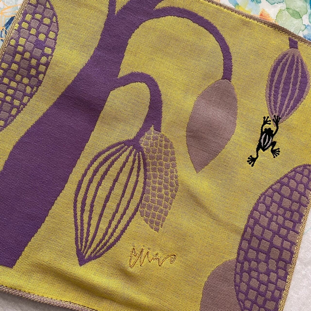 今回の「花とカエル」はベースがイエローなんですが、マスタードカラーのようなぱきっとした黄色ではない柔らかいイエローが使われています。