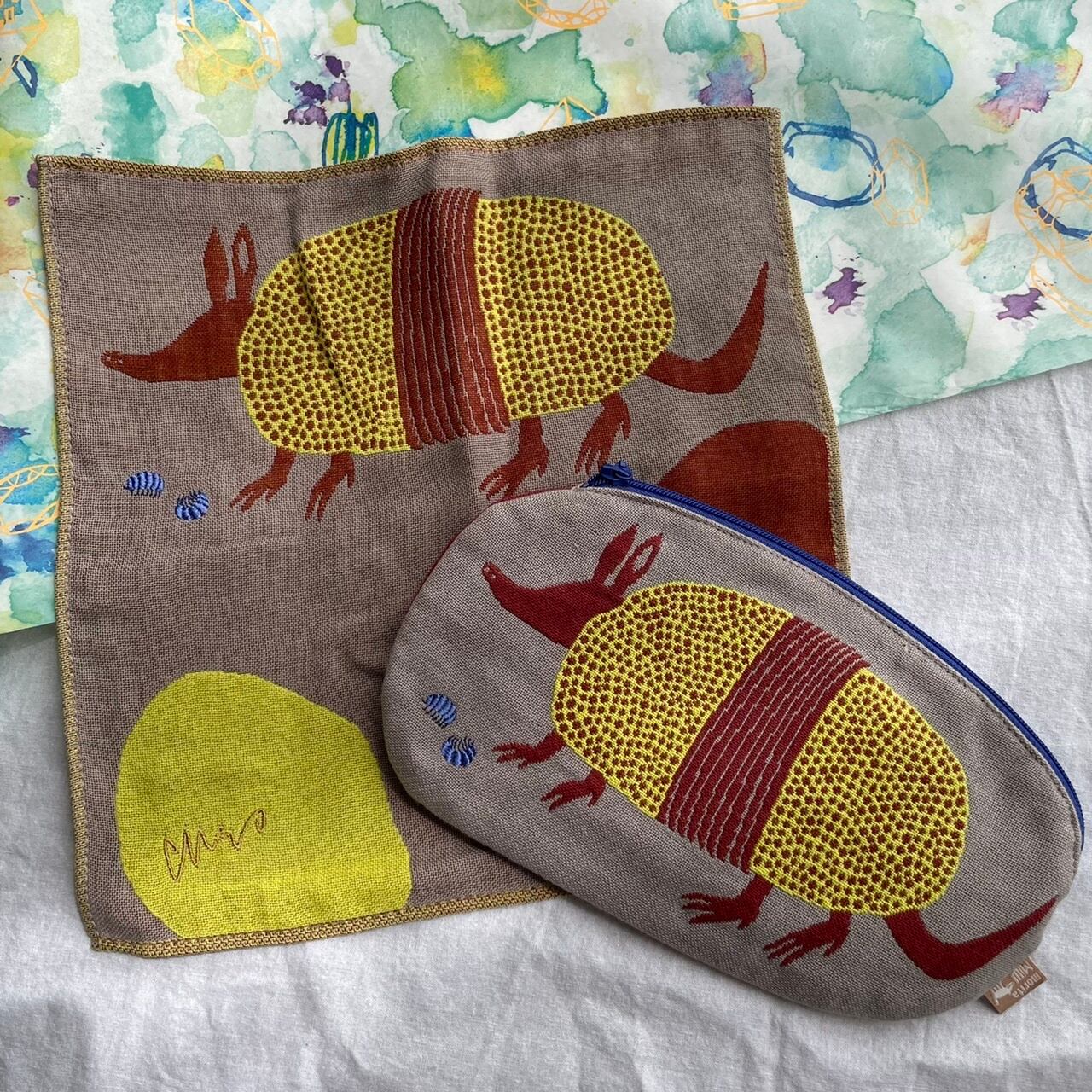 ハンカチとお揃いで贈り物にしても喜ばれるカワイイアルマジロと団子虫。