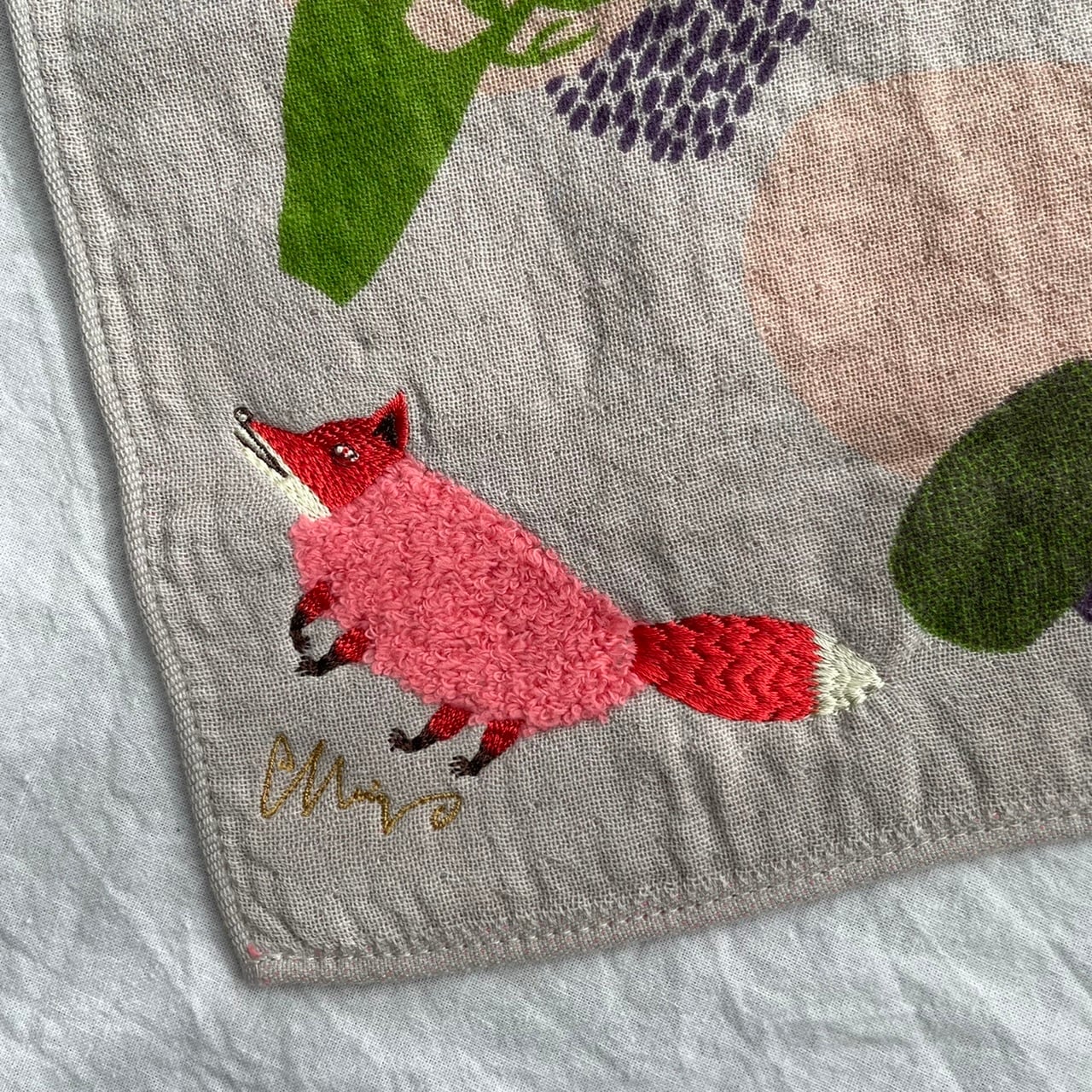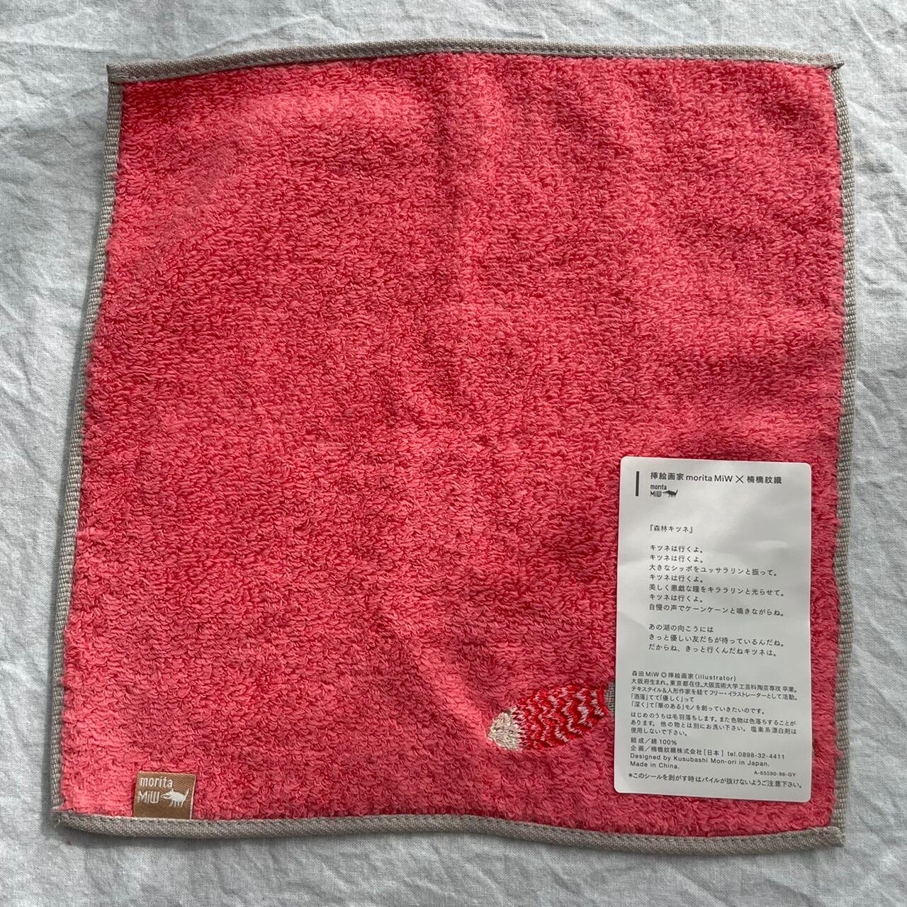 moritaMiW×楠橋紋織 モコモコドウブツハンカチ 森林キツネ きつね ピンク クリスマスプレゼント 森田MiW ハンカチ 刺繍