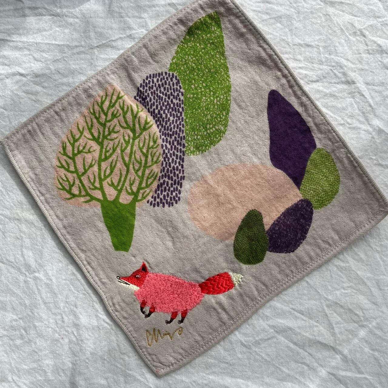 森田MiWさんが描くほのぼのとした優しい森林の中を、まるで意を決したように歩くキツネのモチーフが美しいモコモコドウブツハンカチ。