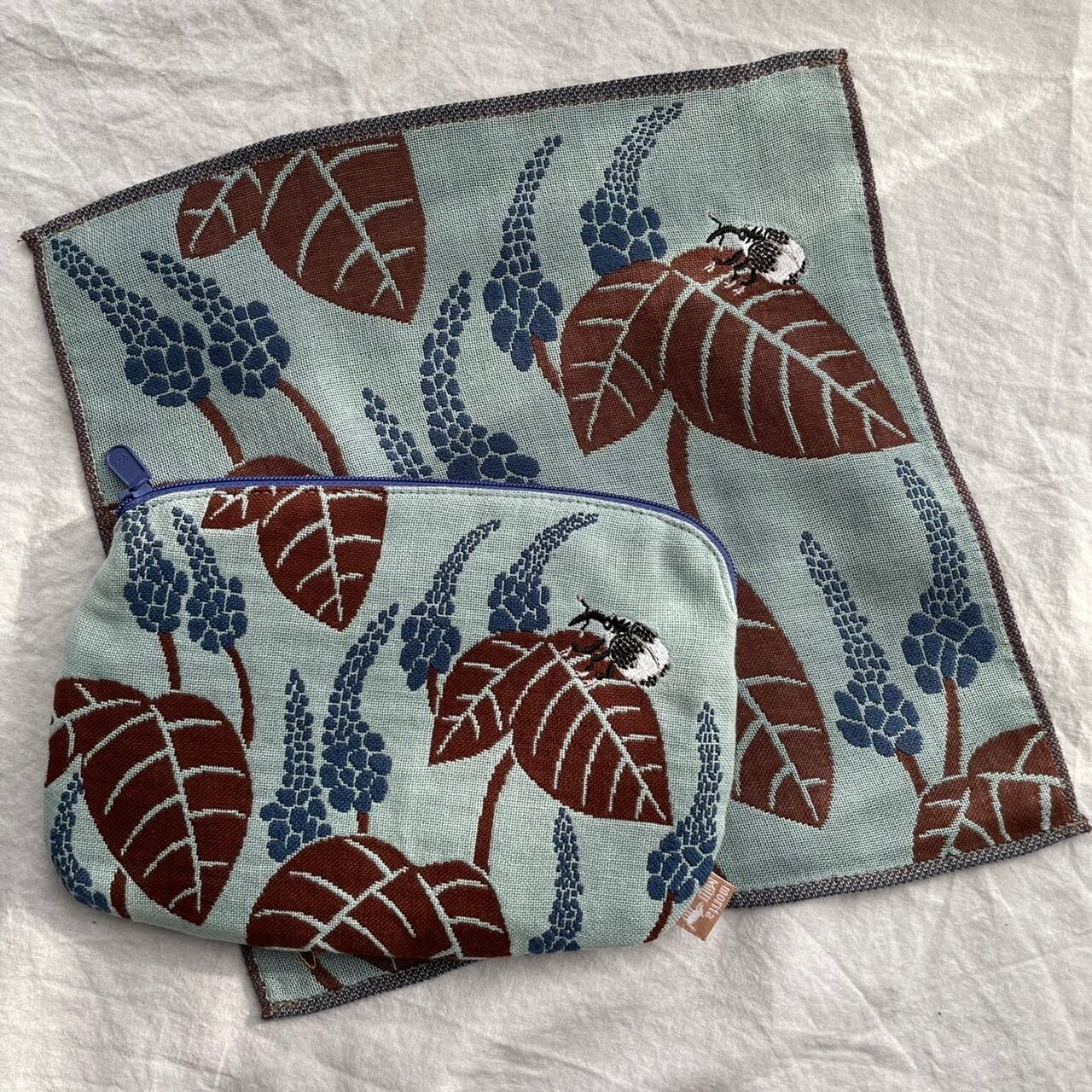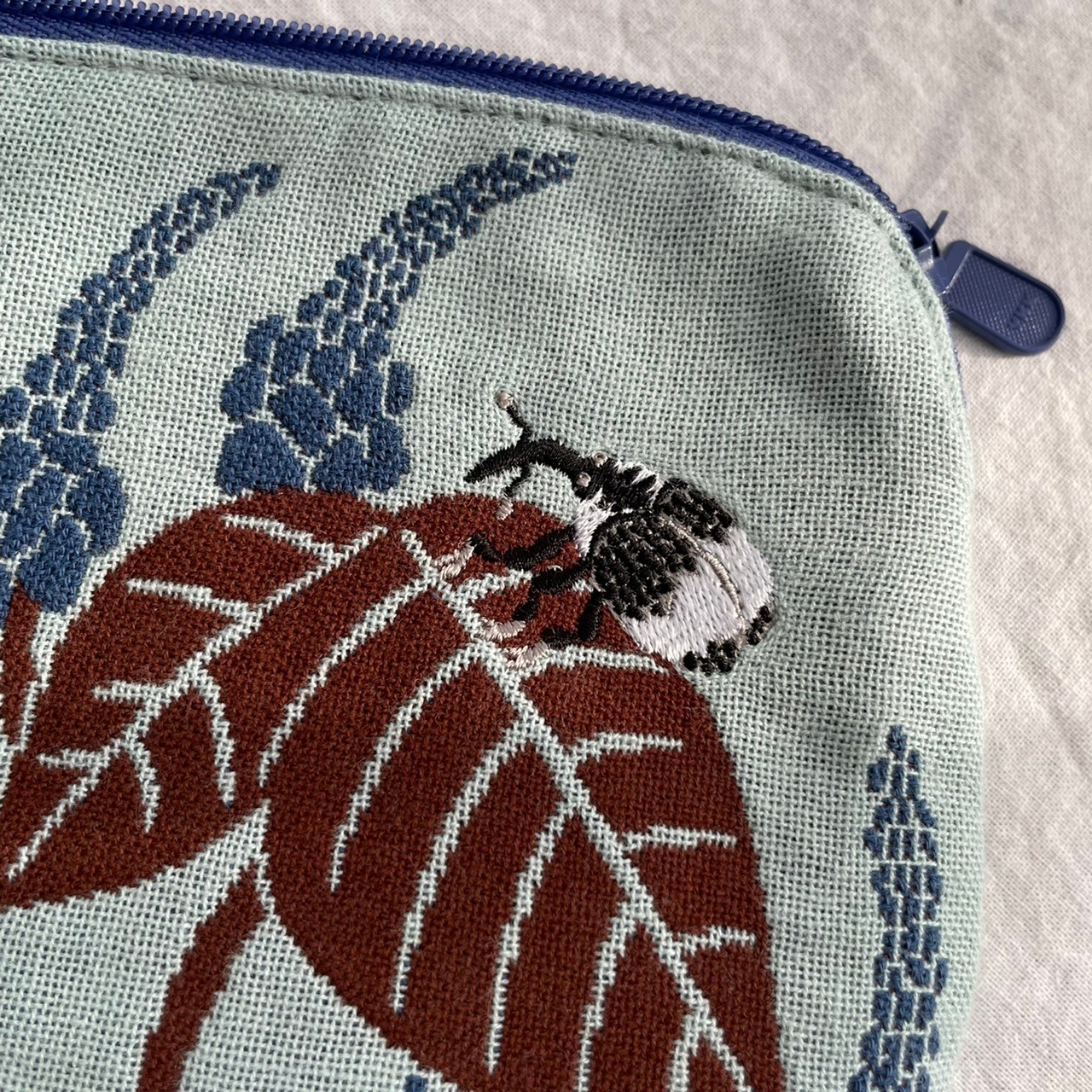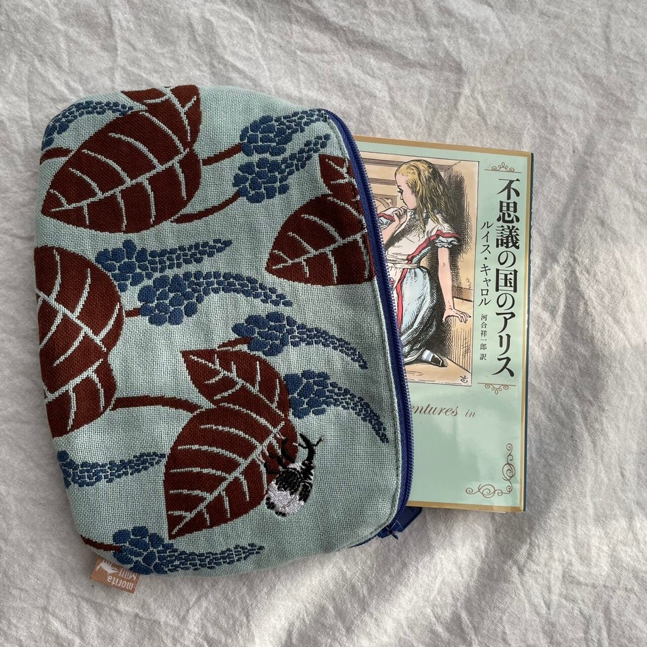 「ゾウムシっていったい何?」から始まってまじまじと刺繍を眺めていたら、なんだか一生懸命に見えて愛着が沸いてくる始末。葉っぱの上を歩いている小さな小さなゾウムシさんの姿が描かれているのですが、ハンカチもお洒落でしたがポーチも凄くお洒落。写真よりも実物の方が良さを物語っている商品です。