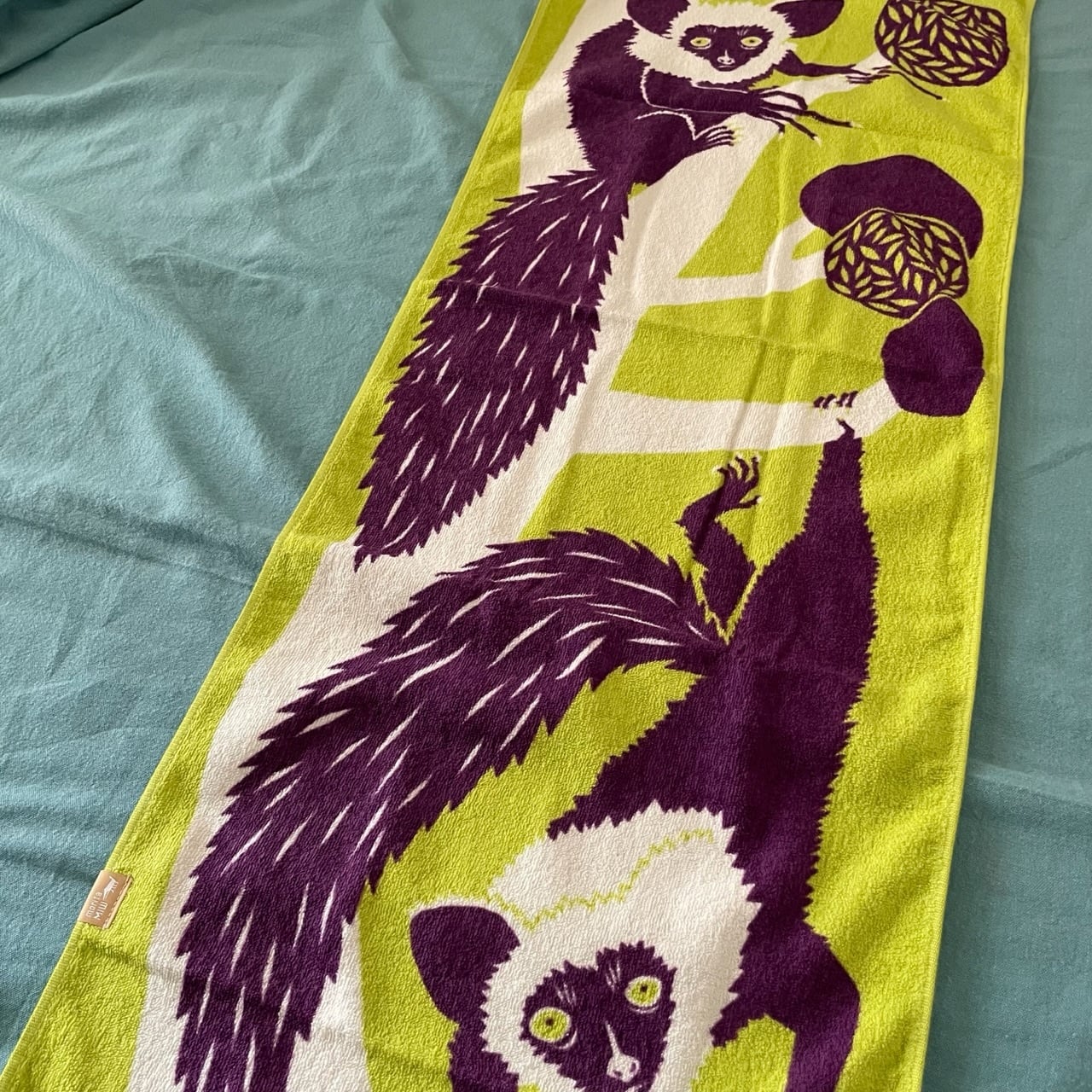 森田MiW×楠橋紋織のコラボブランドから、とてつもなくツボな使いやすいデザインと機能を兼ね備えたタオルてぬぐいが登場しました。これは「掴まるアイアイ姉妹」と名付けられた作品。