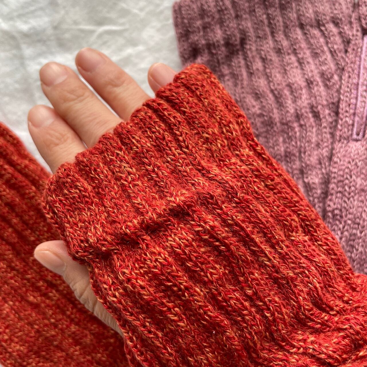 指先が出ているタイプのアームウォーマー、お客様に大好評いただいて、今回は親指穴があるタイプのモノをセレクトしました。