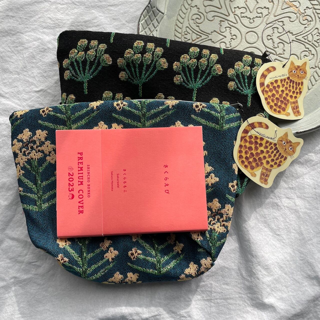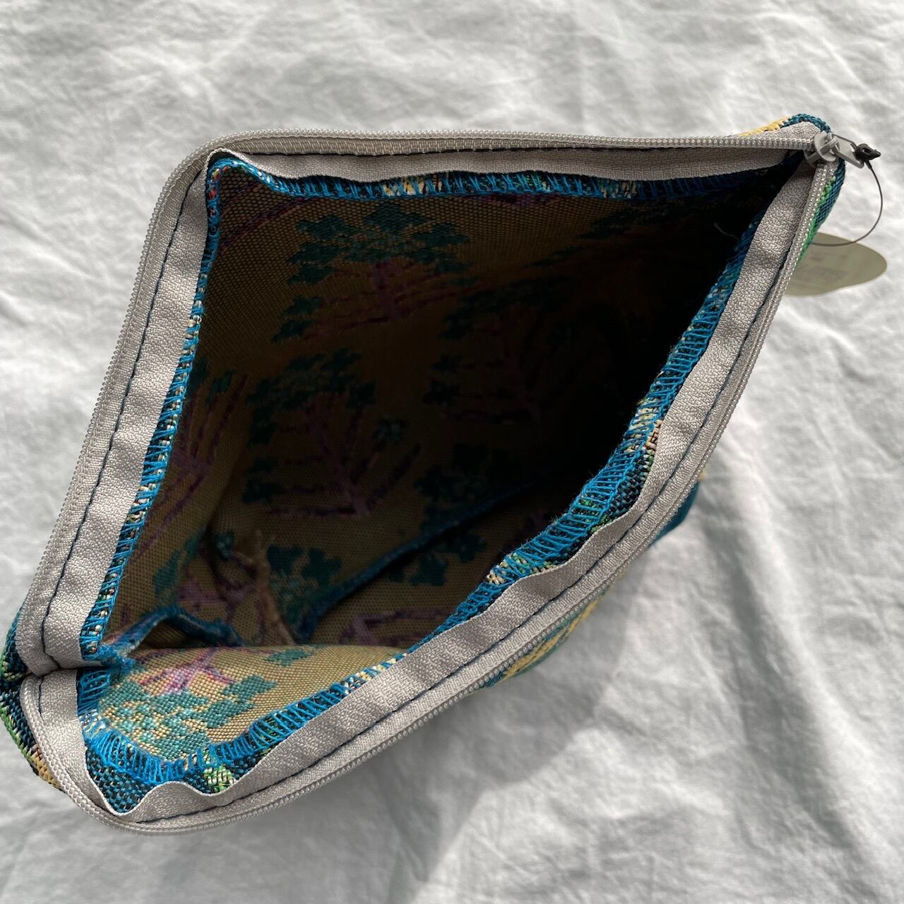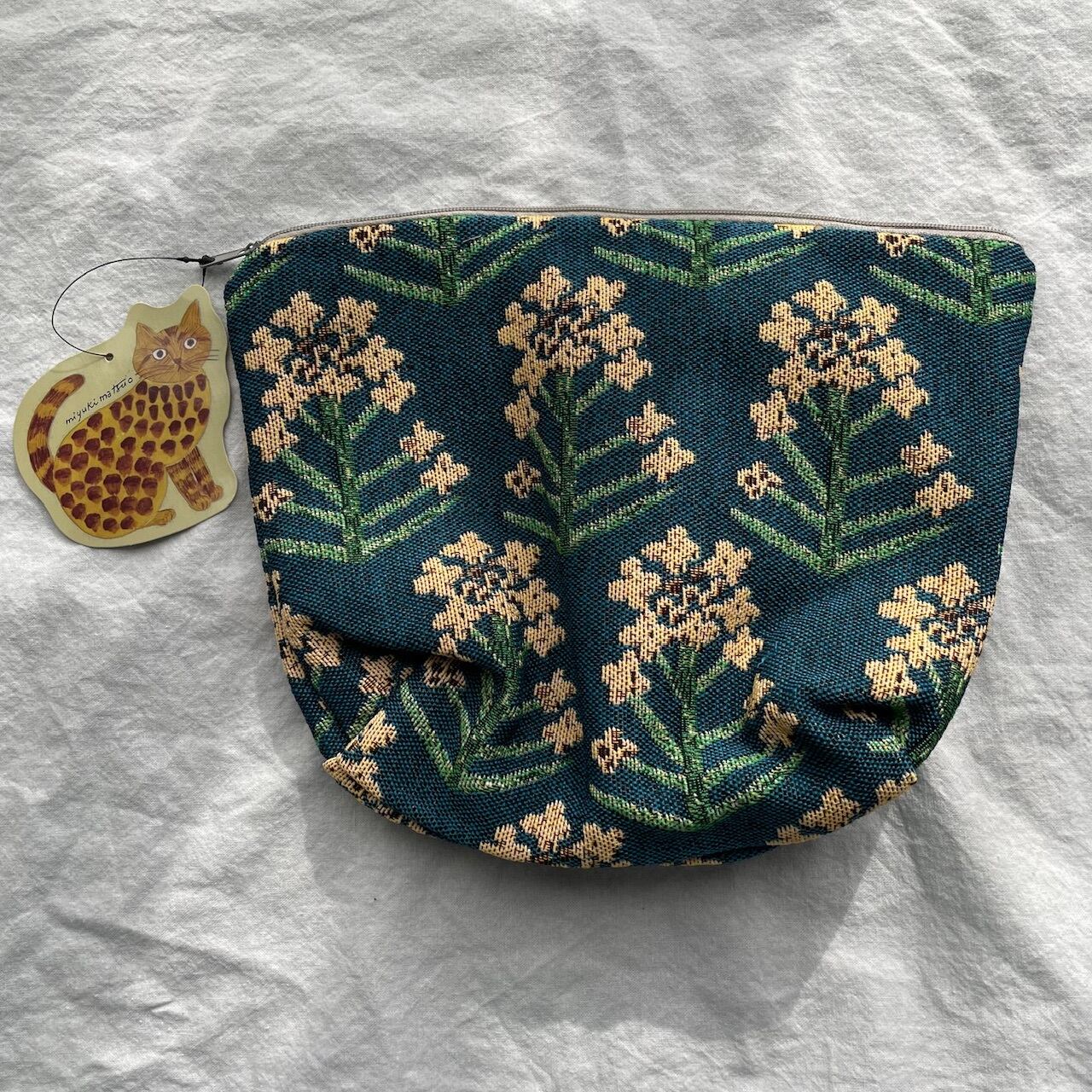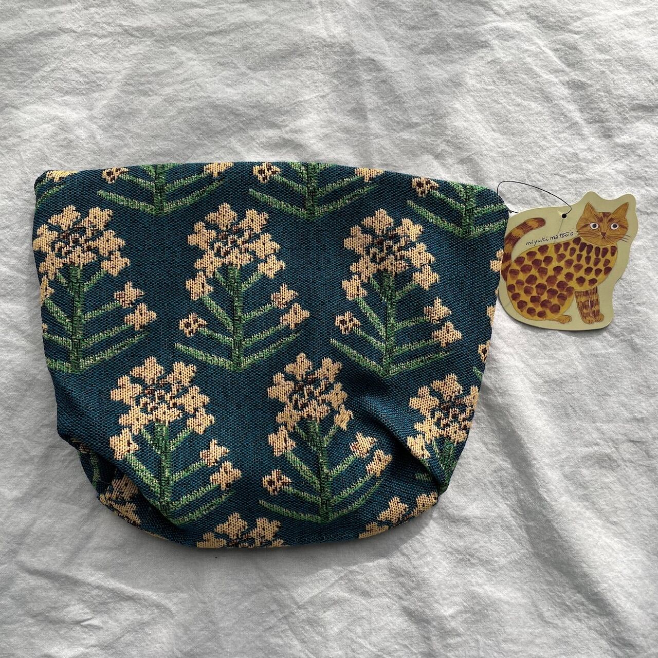 美しい青に明るい菜の花が描かれた松尾ミユキさんのトラベルポーチをセレクトしました。