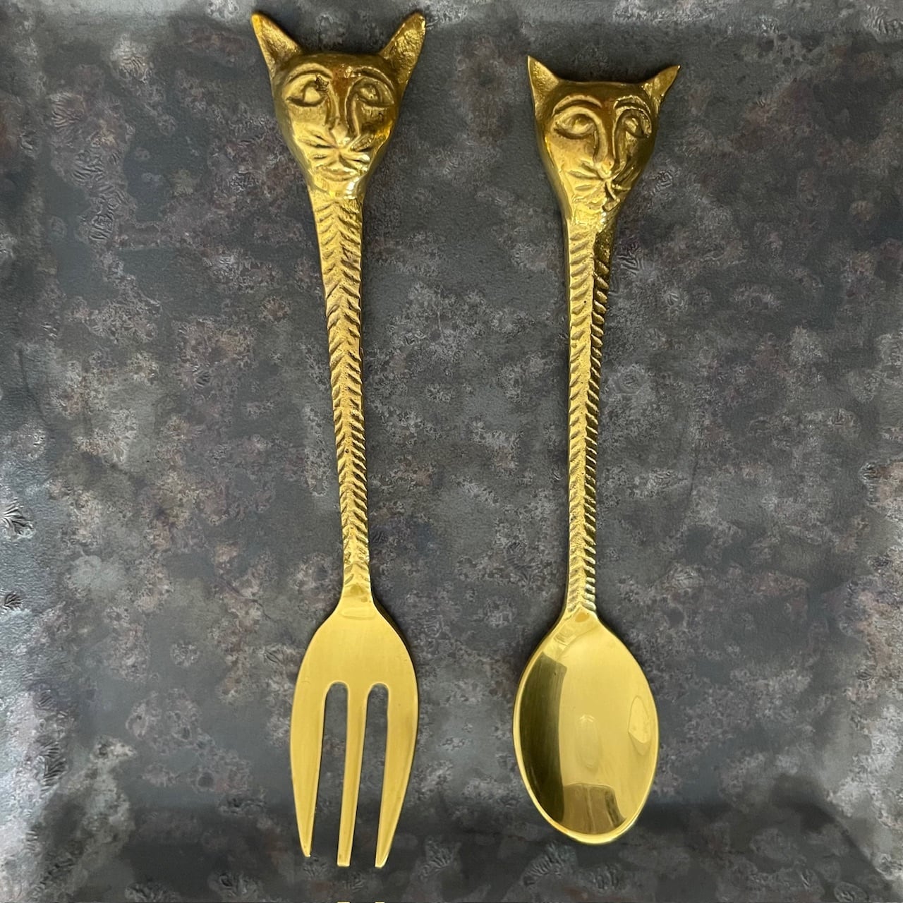 アンティーク調の猫が可愛いフォークとスプーン 真鍮 猫 ブラス カトラリー デザートスプーン デザートフォーク ねこ ゴールド テーブル クリスマス プレゼント