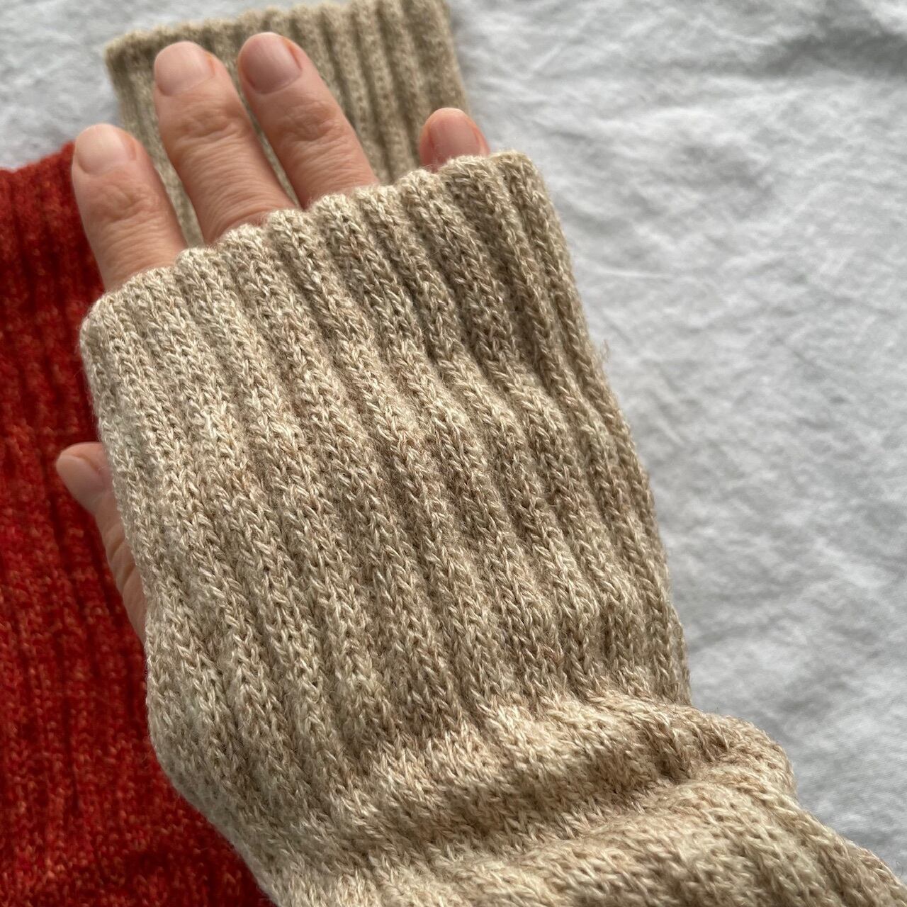 指先が出ているタイプのアームウォーマー、お客様に大好評いただいて、今回は親指穴があるタイプのモノをセレクトしました。