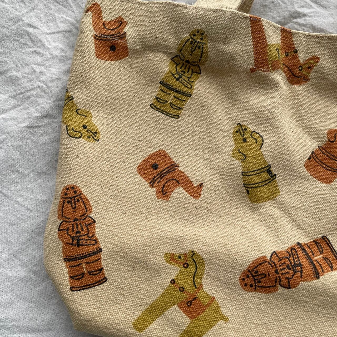 埴輪がランダムにプリントされた、面白くて可愛いミニトートをセレクトしました。